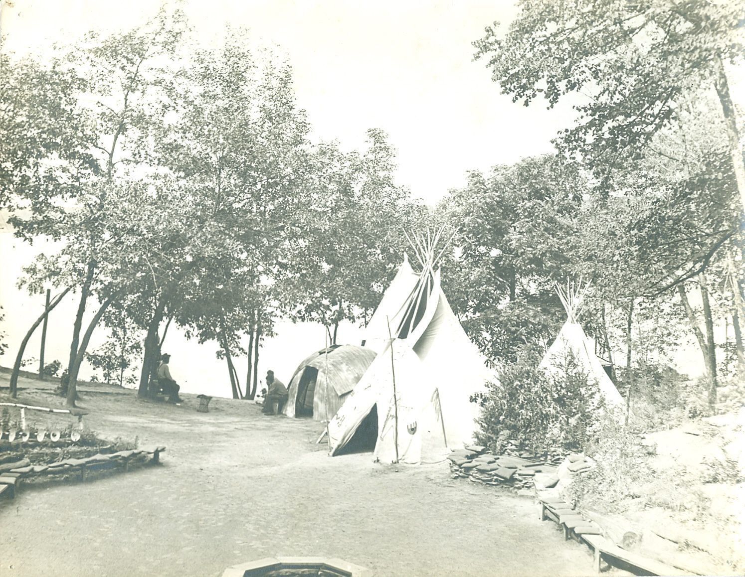 Black and white photograph of three tipi's and a wigwam in a clearing. There is a circle fire pit in the foreground of the photo and what looks like benches for sitting near by. Two, possibly three men are sitting outside of the wigwam.Collection