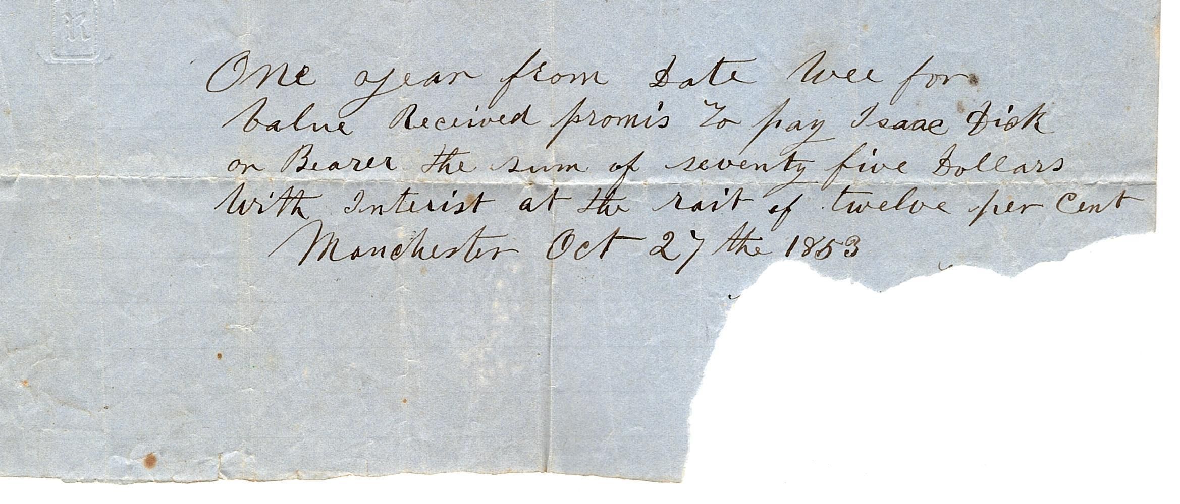 Half sheet of blue paper with writing in black ink that reads "One year from date -- for value Received promis [sic] to pay Isaac Dick or Bearer the sum of seventy five dollars with interest at the rait [sic] of twelve per cent, Manchester Oct 27th 1853." The signature has been torn off.Collection
