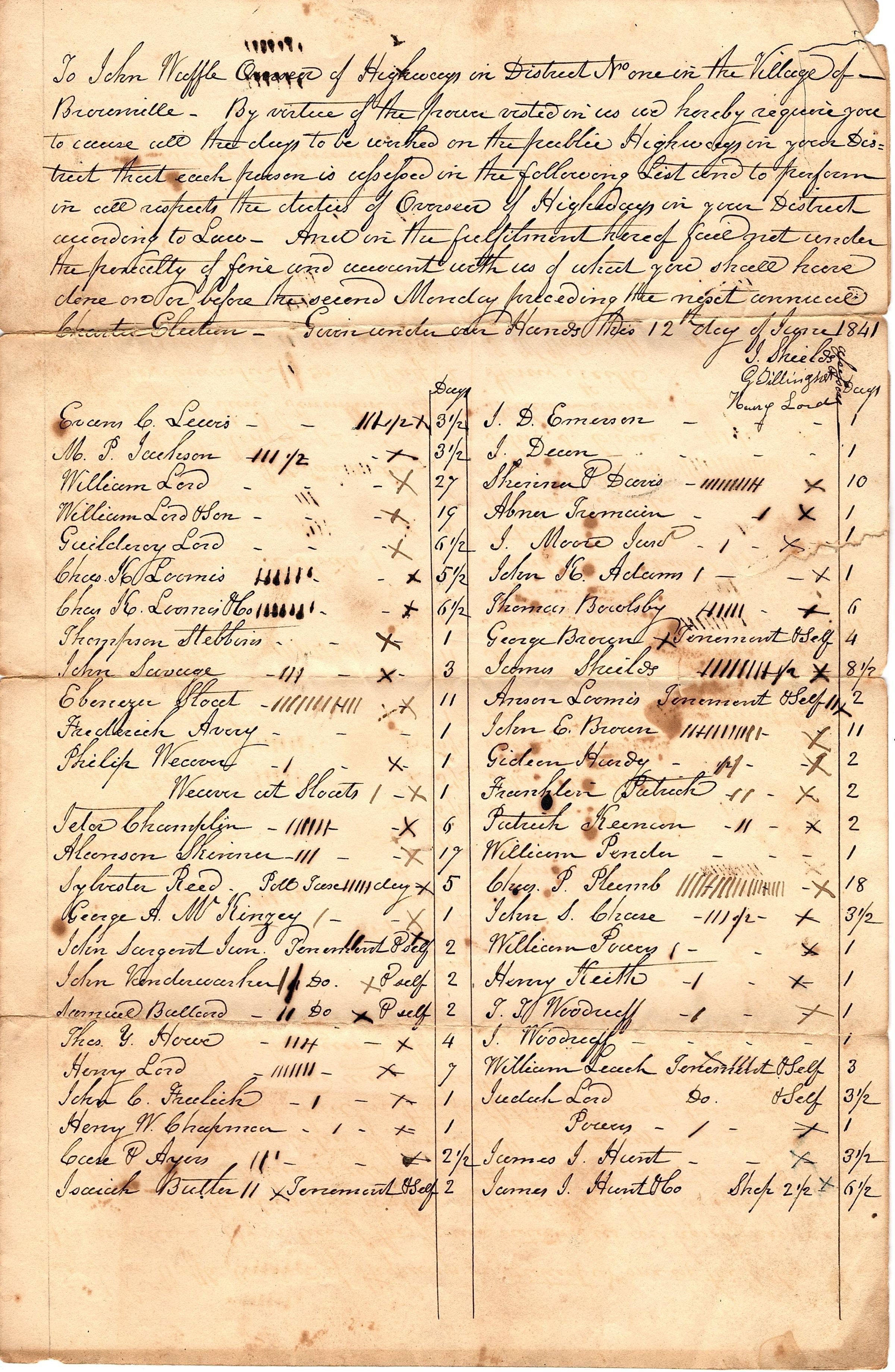 Large sheet of paper that was folded to create four pages. Only the first page and the last page have writing on them (the middle two pages are blank). The first page has a paragraph at the top in black ink and four columns at the bottom (names, days, names, days) or two columns of names and days. The first sentence reads "To John Waffle owner of Highways in District No one in the Village of Brownville..." The last page is a cover page that reads "John WAffle -- Master in District No one 1841".Collection