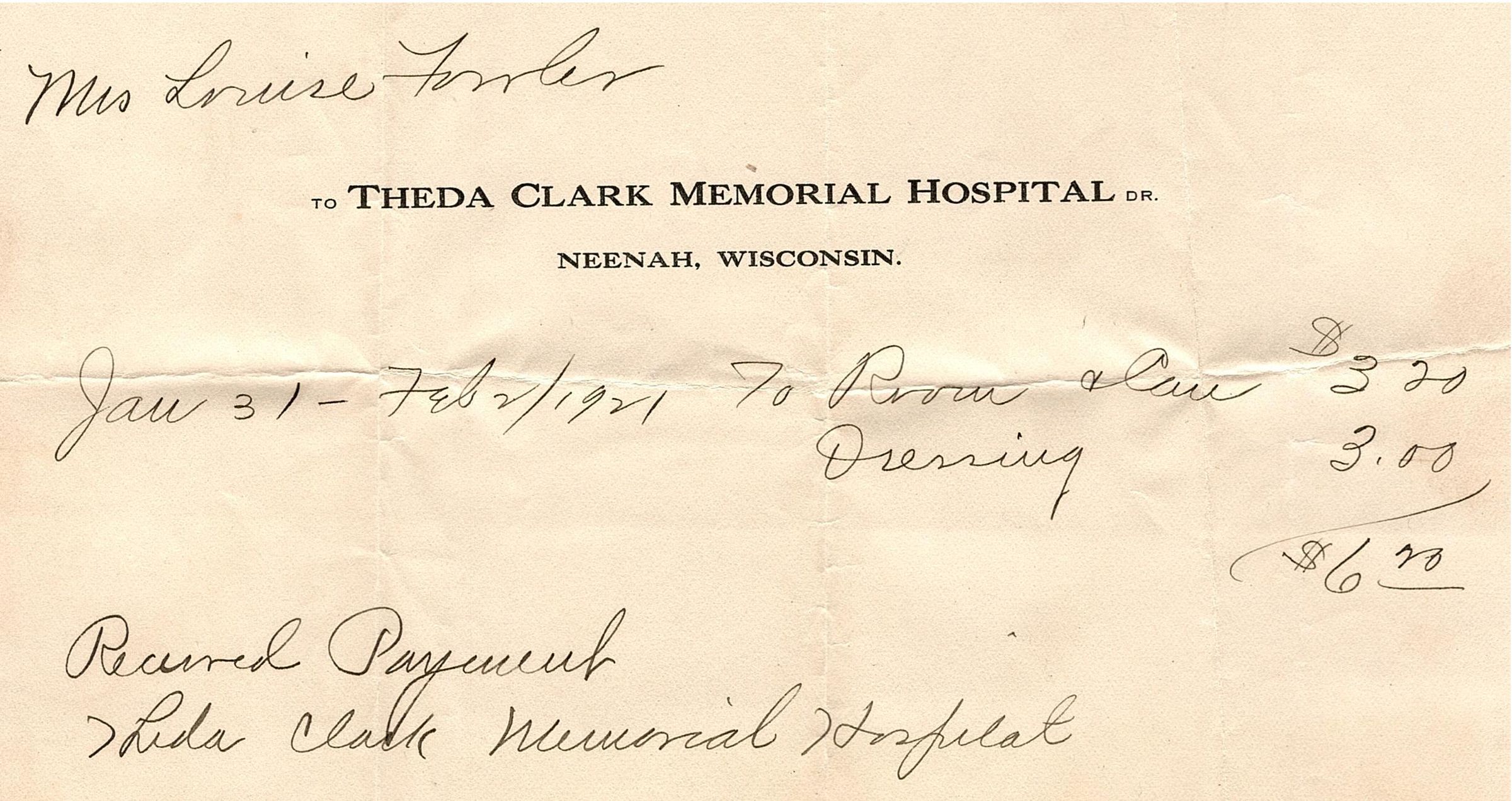 Half sheet of paper with printed letterhead and filled out with black ink. Letterhead reads "To Theda Clark Memorial Hospital Dr., Neenah, Wisconsin" and is filled out for Mrs. Louise Fowler for Jan 31-Feb 2, 1921 for the cost of $6.00. At the bottom it says the hospital received payment.Collection