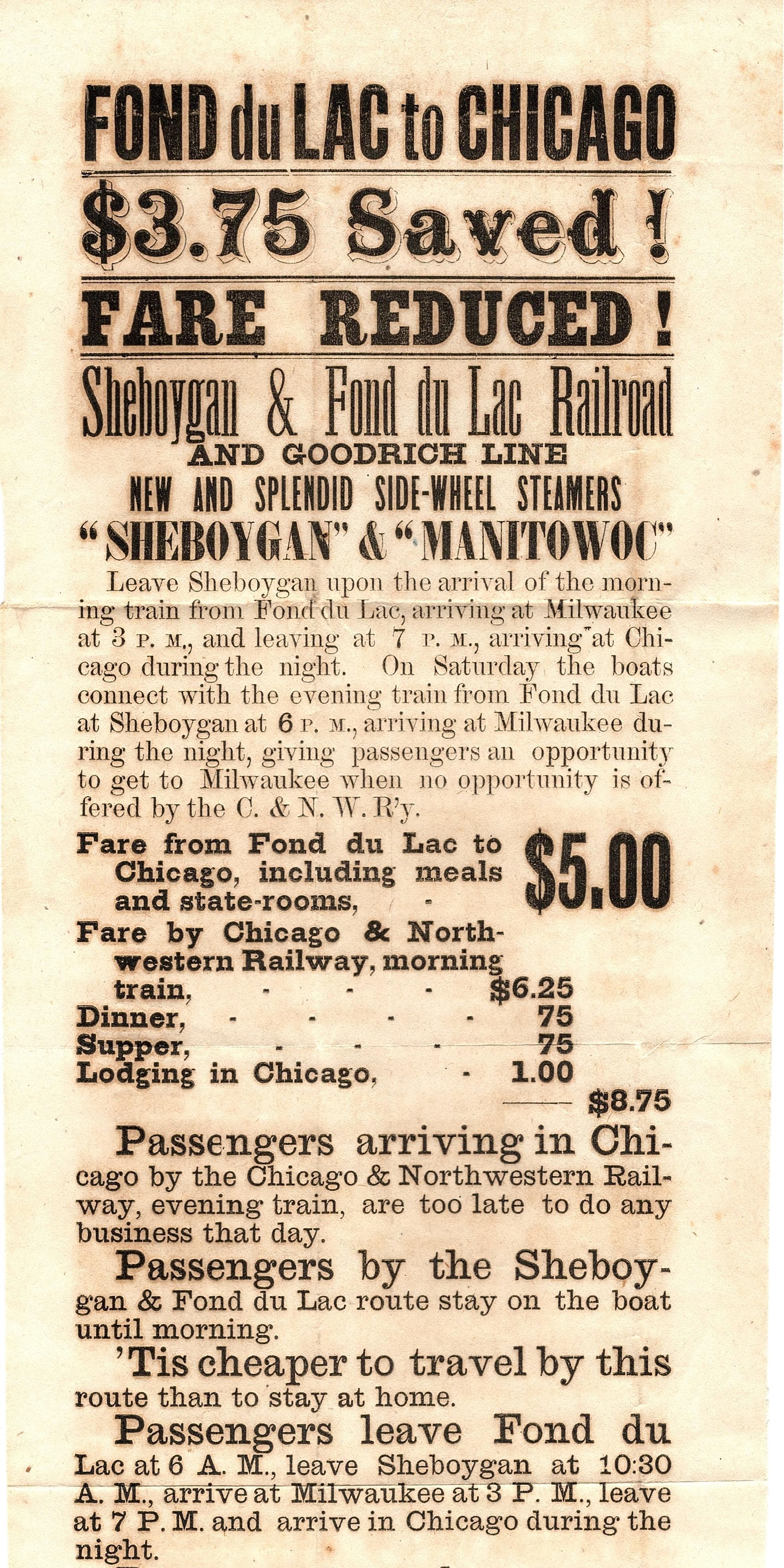Tall, thin piece of paper with a mix of large bold print and small print advertising the train from Fond du Lac to Chicago. It starts "Fond du Lac to Chicago $3.75 saved! Fare reduced! Sheboygan & Fond du Lac Railroad and Goodrich Line".Collection