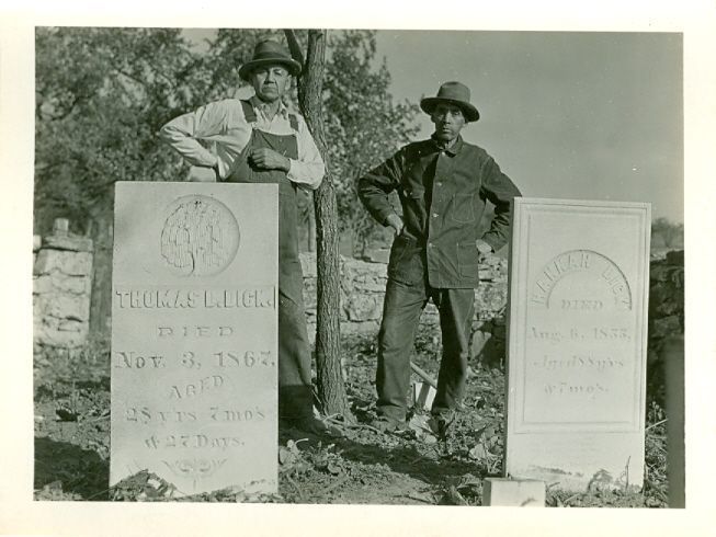 Four identical black and white photographs of two men standing behind two headstones. The headstone on the left belongs to "Thomas D. Dick. Died Nov. 3, 1867, Aged 28 yrs 7 mo's & 27 days." The man standing behind this headstone is wearing a light colored shirt under dark overalls and a hat. His right arm is bent and resting on his upper side and his left arm is bent in front of his chest. The right headstone belongs to "Hannah Dick, died Aug 6, 1833, Aged 88 yrs & 7 mos." The man standing behind this headstone is wearing a dark button up, long-sleeved jacket, dark pants, and a hat. Both of his hands are on his hips. There is a rock wall behind them.