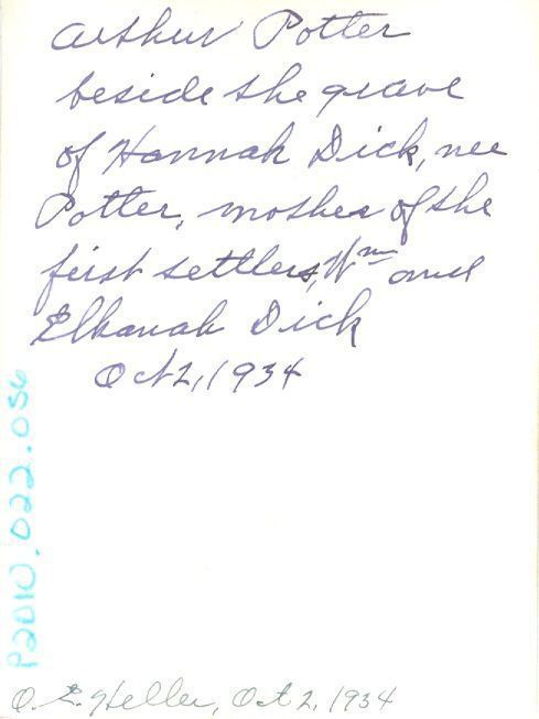Written in black ink on the back of BC2010.022.056A "Arthur Potter beside the grave of Hannah Dick, once Potter, mother of the first settlers, -- and Elhanah? Dick, Oct 2, 1934" and in the bottom right corner "O.E. Heller, Oct. 2, 1934".