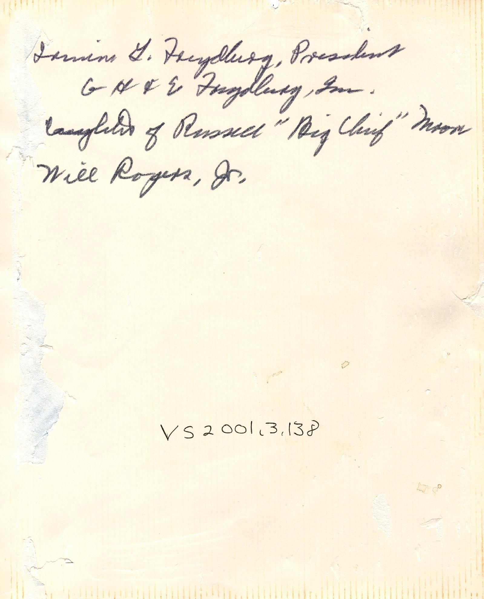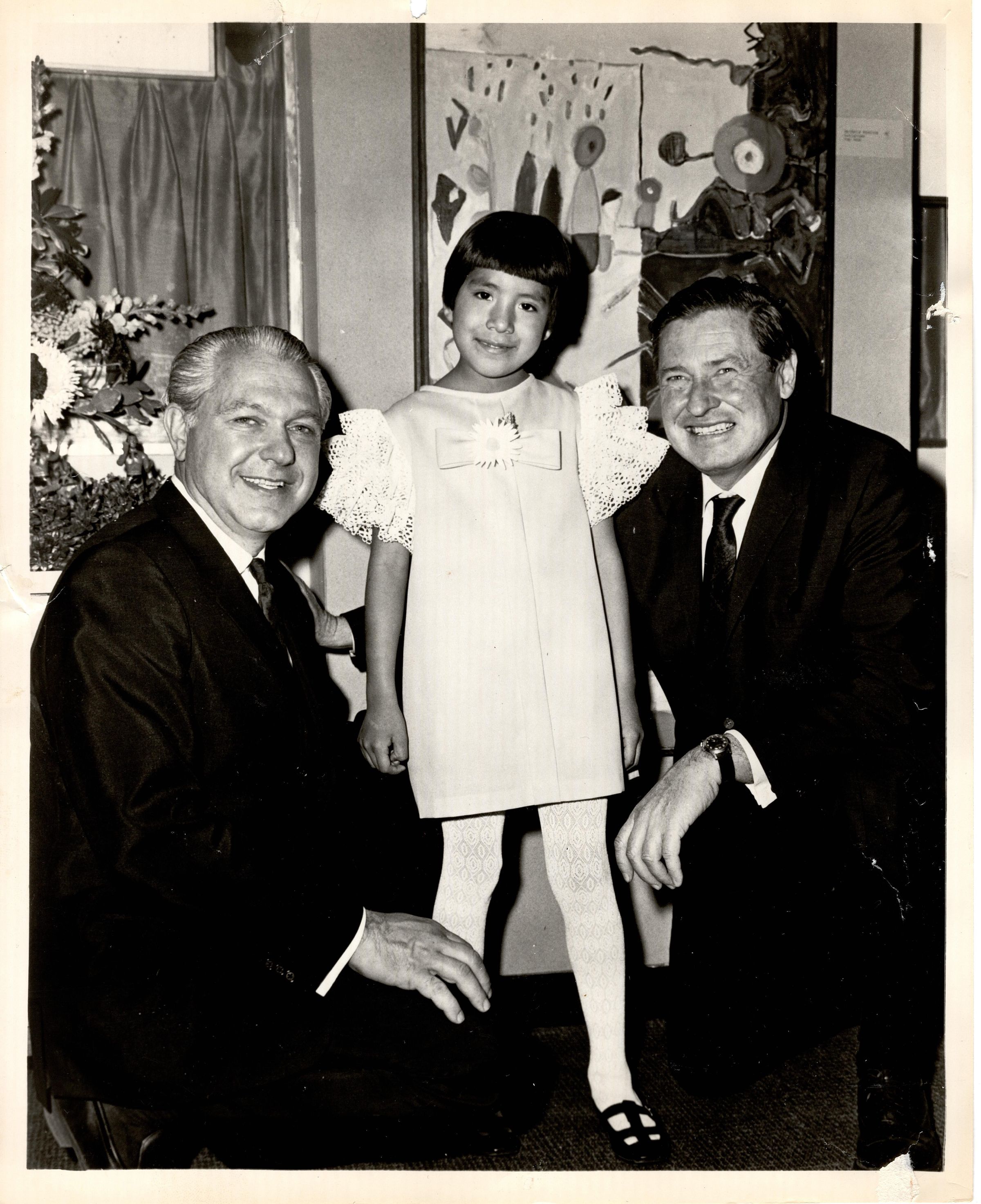 Black and white photograph of two men in suits kneeling with a young girl in a dress standing between them. Written on back in black ink "Irwin G. Frydburg, President G H & E Frydburg, Inc. Daughter of Russell "Big Chief" Moon. Will Rogers, Jr."Photograph Details