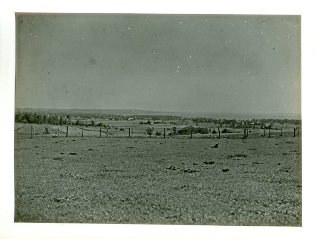 Black and white photograph from a hill looking out over farm lands and possibly a lake in the background (Lake Winnebago?).