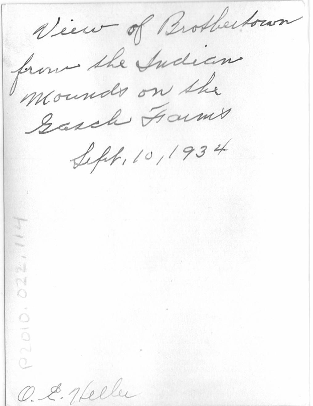 "View of Brothertown from the Indian Mounds on the Gasch farms. Sept. 10, 1934" and in a different ink at the bottom "O.E. Heller"Location