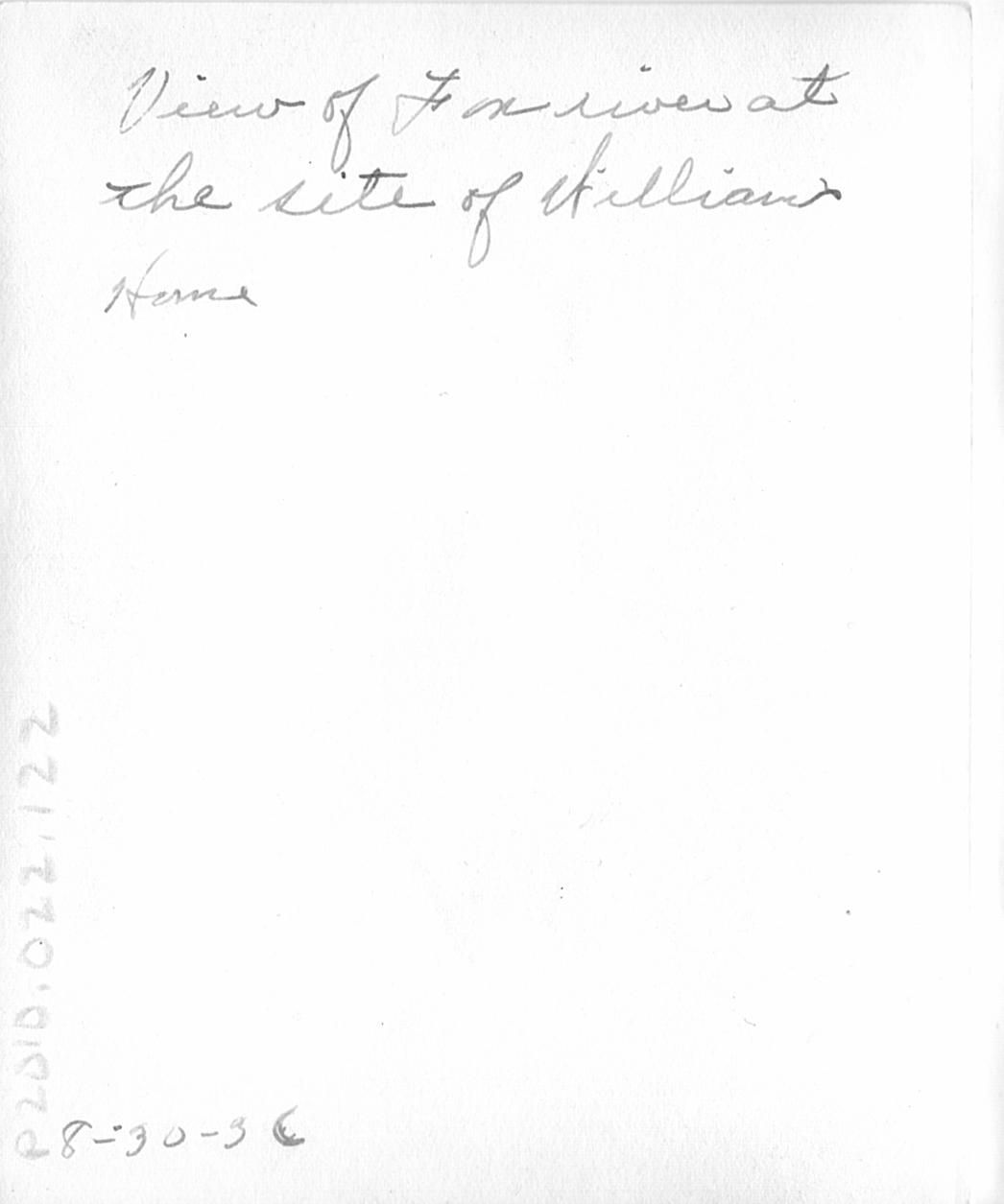 Written in black ink on the back "View of Fox river at the site of Williams Home. 8-30-36".Collection