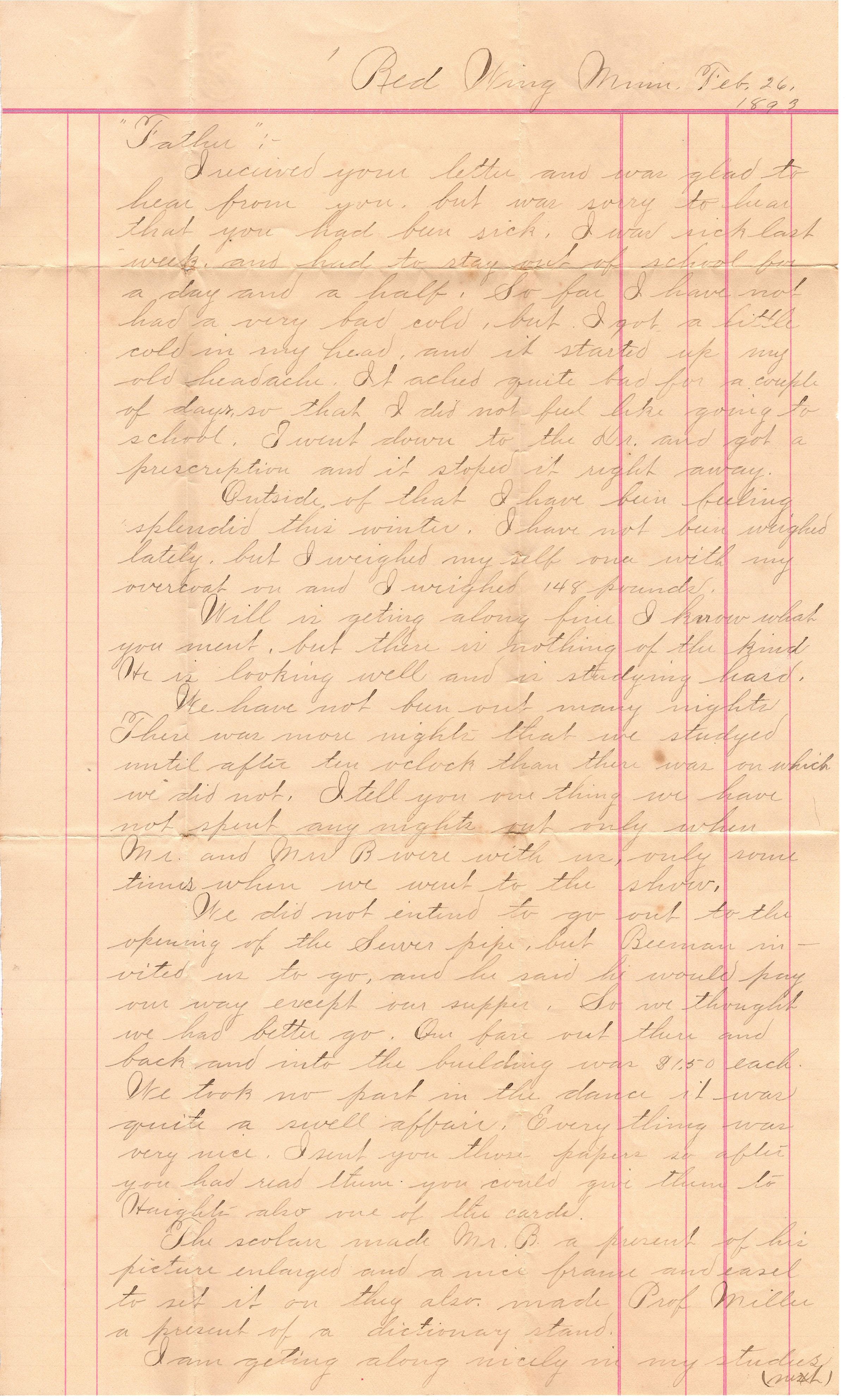 Single page correspondence on a page from a ledger book with columns made from pink lines. The letter is addressed "Red Wing Minn, Feb 26, 1893, 'Father'". The letter is just an update about his studies (presumably Archie from previous letters). On the back is a list of purchases titled "Report Feb 26 1893" and it ends with "Feb 1 Balance on hand, cash per letter, Total cash receipts, What I owe Will" which is 25 cents. The list contains items like candy, board, paper, cigars, and a hair cut.Collection