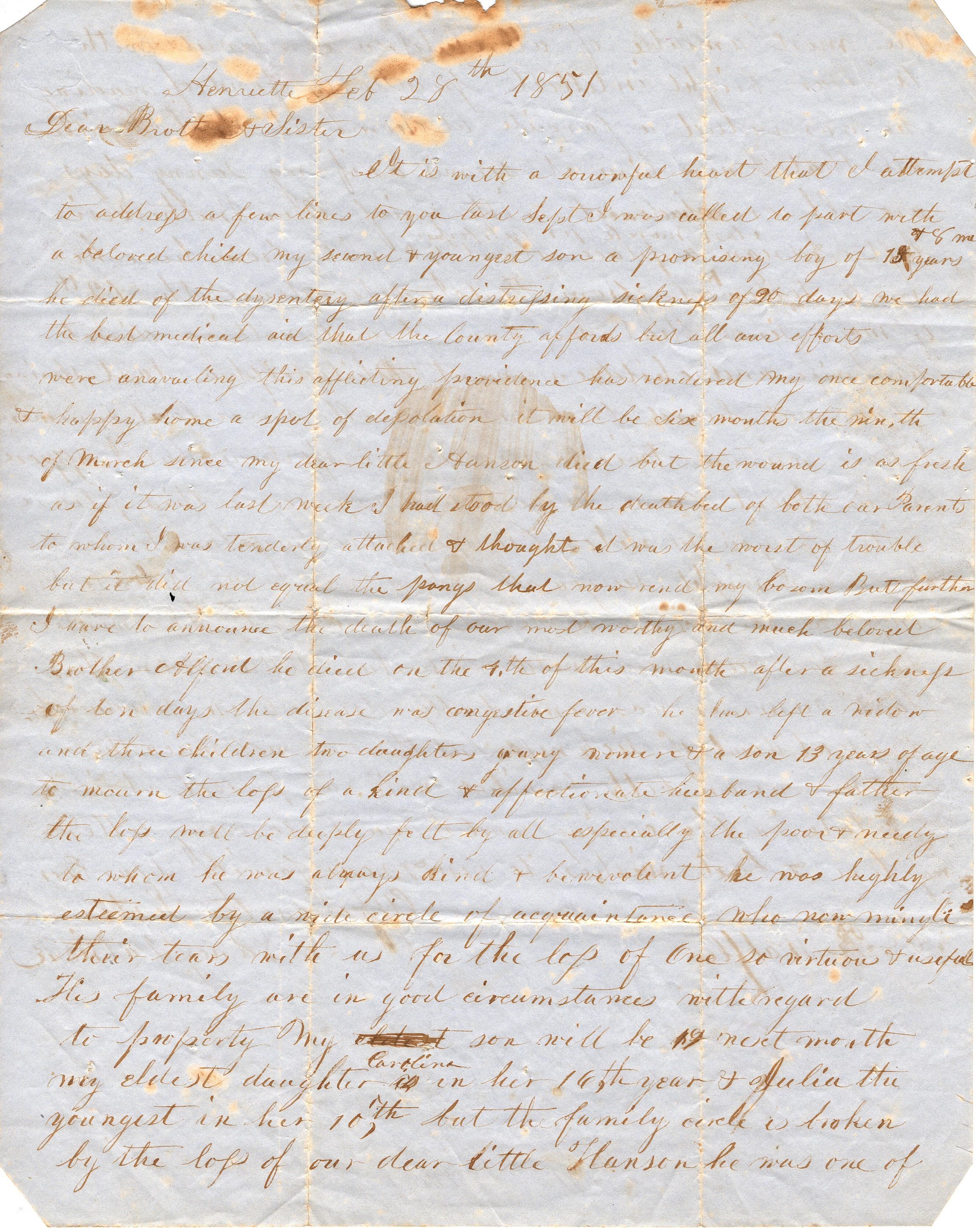 Two page correspondence written on a single sheet of blue paper in what is now a brown colored ink. The letter is addressed "Henriette Feb 28th 1851, Dear Brother and Sister". It talks about the death of her child at the age of 13 from dysentery. She also talks about the rest of her children that range from 19 to 10 yo, both boys and girls. It is signed "Affectionate Sister, Nancy Patrick, Joe R Waffle". Written upside down at the bottom of the second page in a different pen and hand is "When if this you see, rember me. Frank Hubbard, Brownvill jeff, Nya".Collection