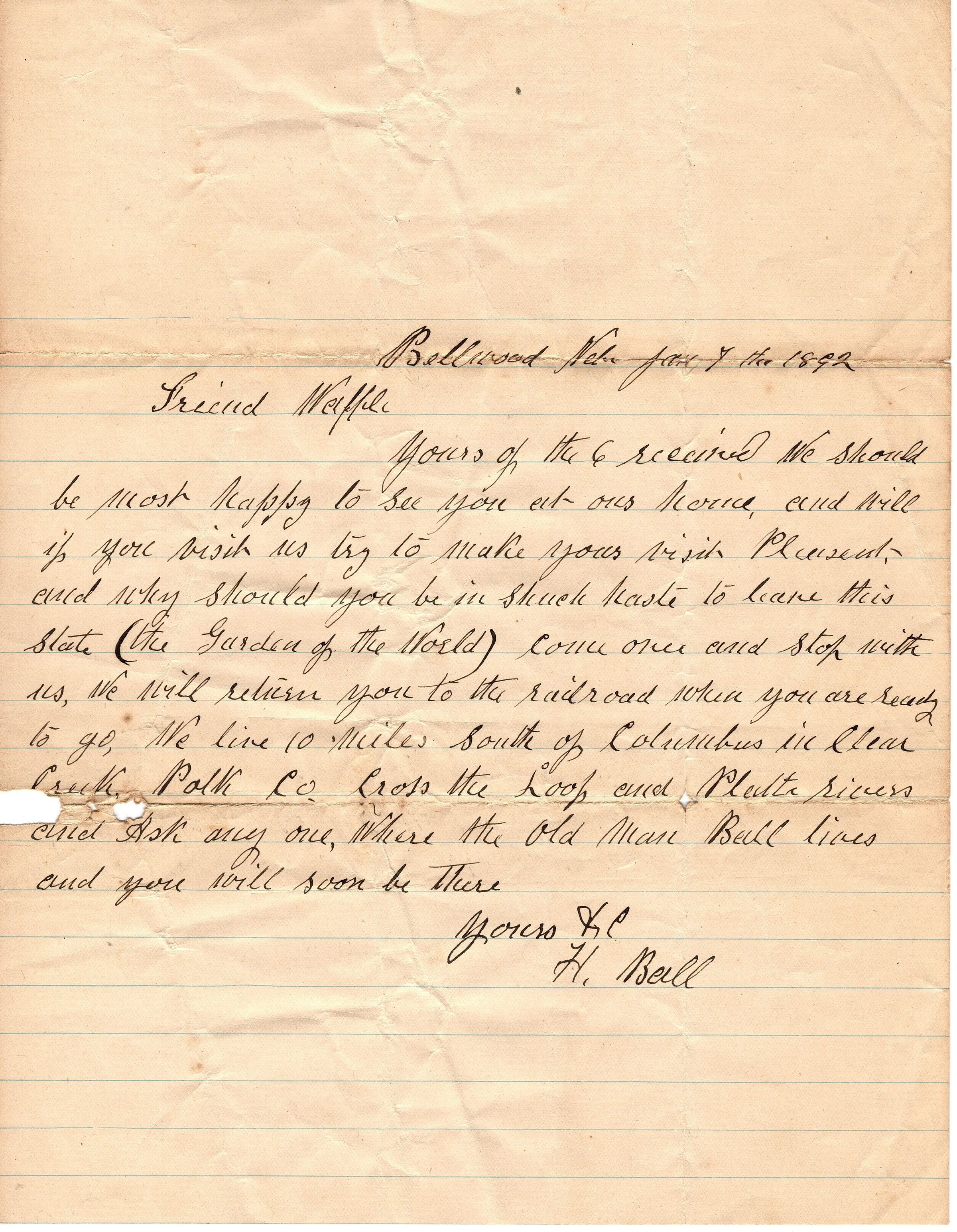 Single page correspondence written on blue lined paper that is addressed "Bellwood N-- Jan 7th 1892, Friend Waffle" and is signed "Yours -- H. Ball". The letter talks about inviting Waffle to their home to stay in "The Garden of the World" which I'm assuming is New Jersey, but they also mention Columbus. The writing is difficult to read because the up strokes are missing or are too light.Collection