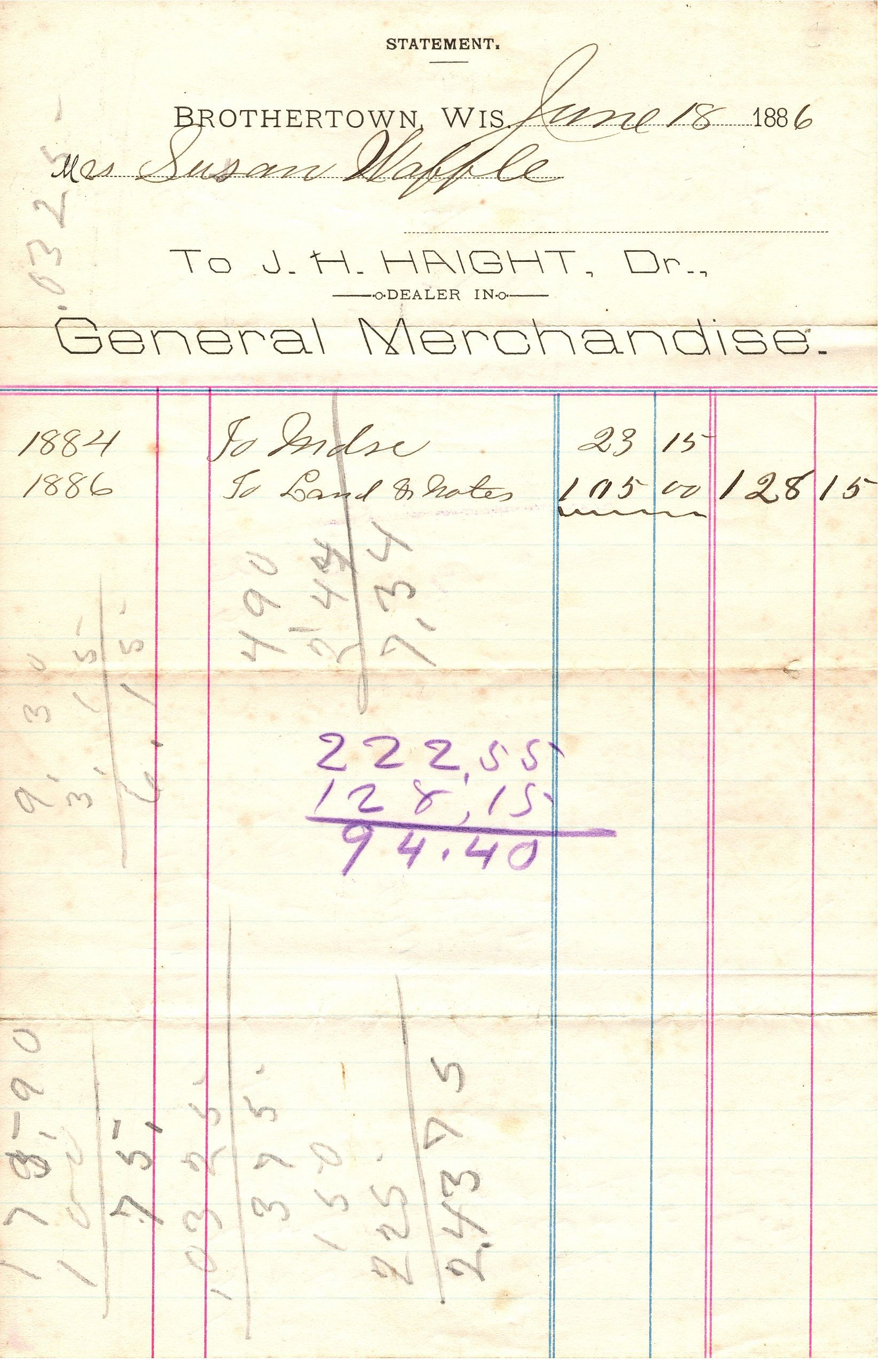 A receipt on lined paper with pink and blue lines and letterhead that reads "Statement, Brothertown Wis., June 18 1886, Mrs. Susan Waffle, to J.H. Haight, Dr., Dealer in, General Merchandise". It appears to be a receipt or expense statement for 1884 and 1886 for $128.15. There additional numbers written all over the paper on both the front and the back in pencil and purple pencil.Collection