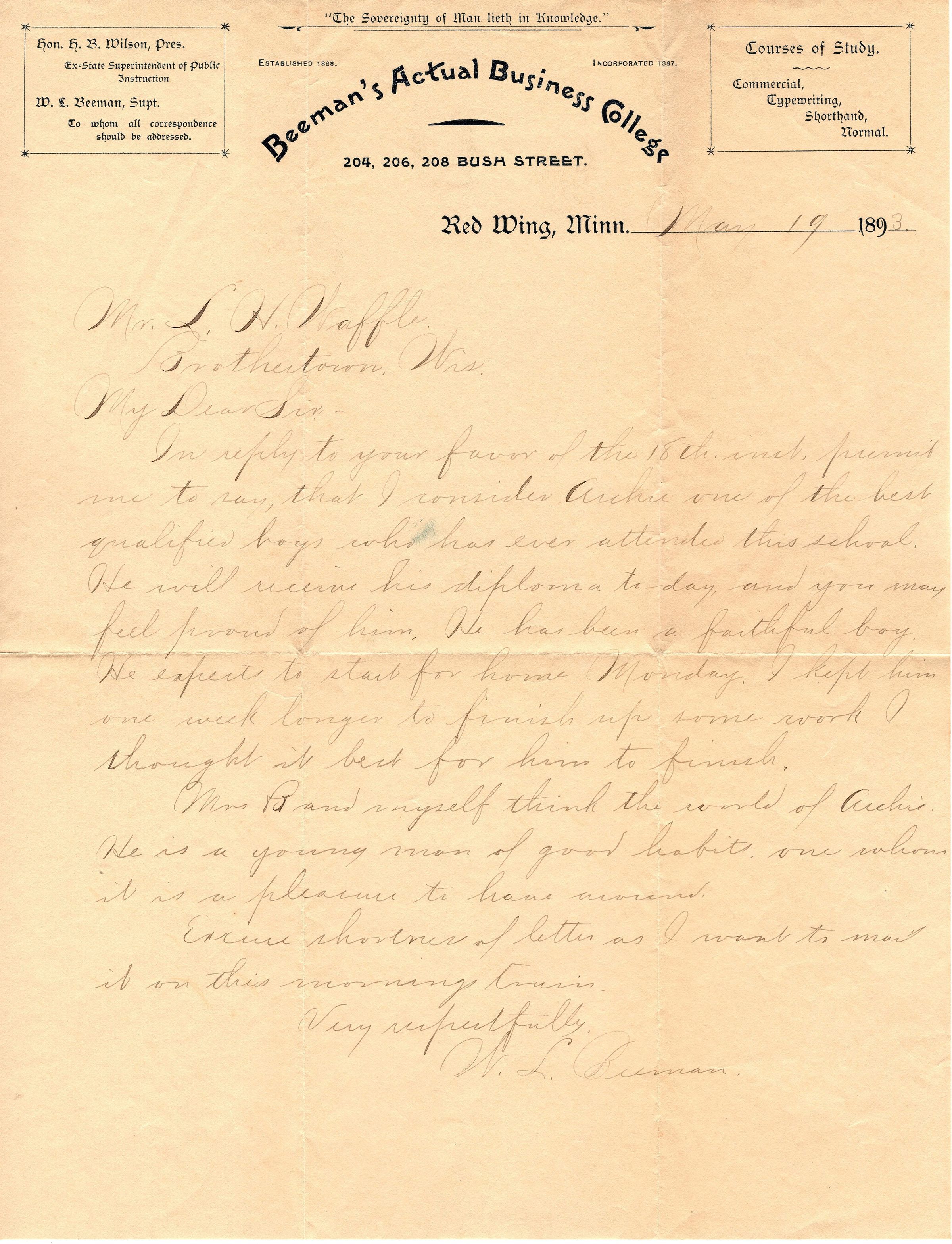 Single page correspondence on paper with letterhead for "Beeman's Actual Business College, 204, 206, 208 Bush Street., Red Wing, Minn." Dated May 19,1893 and addressed to "Mr. L.H. Waffle, Brothertown, Wis, My Dear Sir". It talks about his son Archie's graduation and signed "Very respectfully, W.L. Beeman".Collection