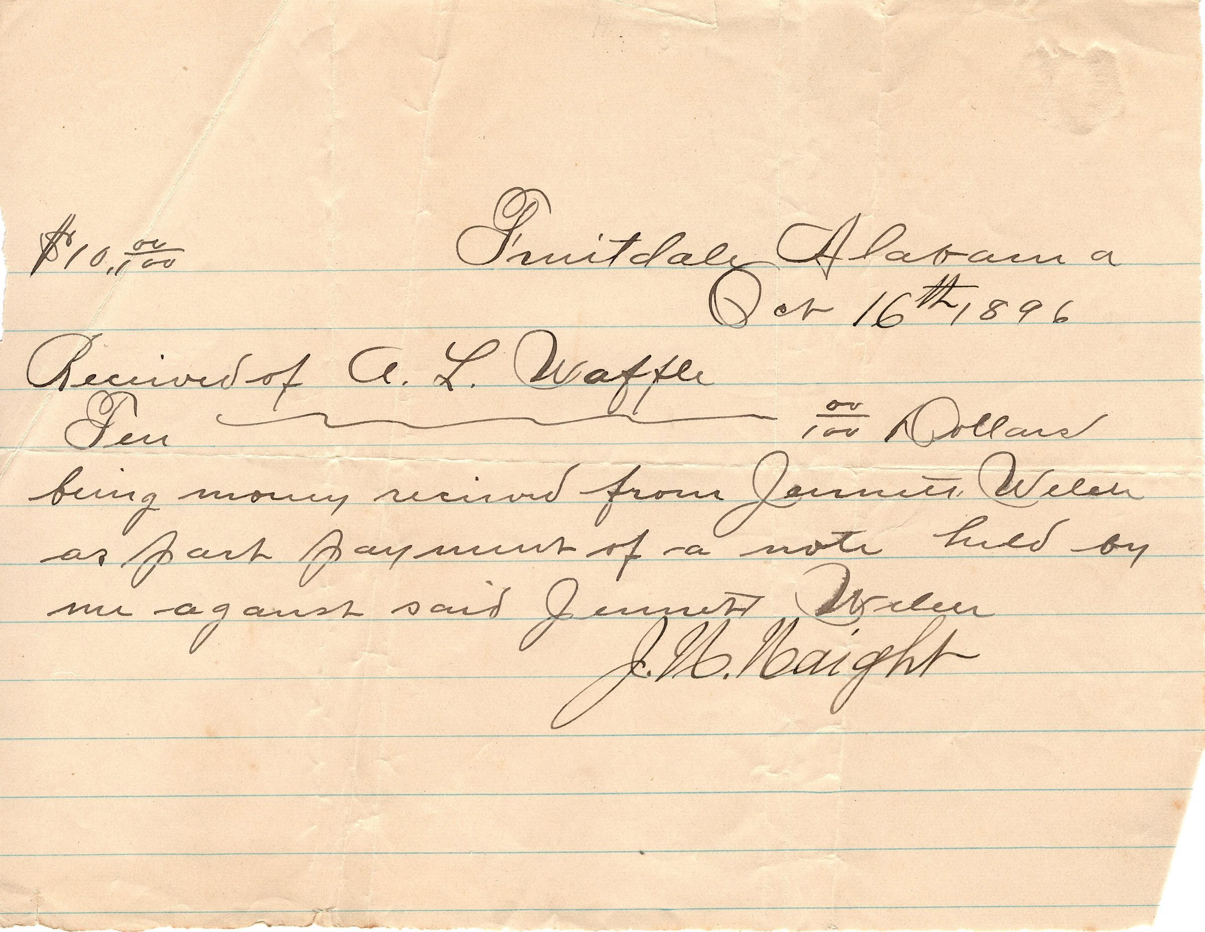 Hand written receipt that reads "Fruitdale, Alabama, Oct 16th 1896, Received of A.L. Waffle, Ten Dollars, being money received from Jeannett Welch as part payment of a note held by me against said Jeannett Welch, J.H. Haight".Collection