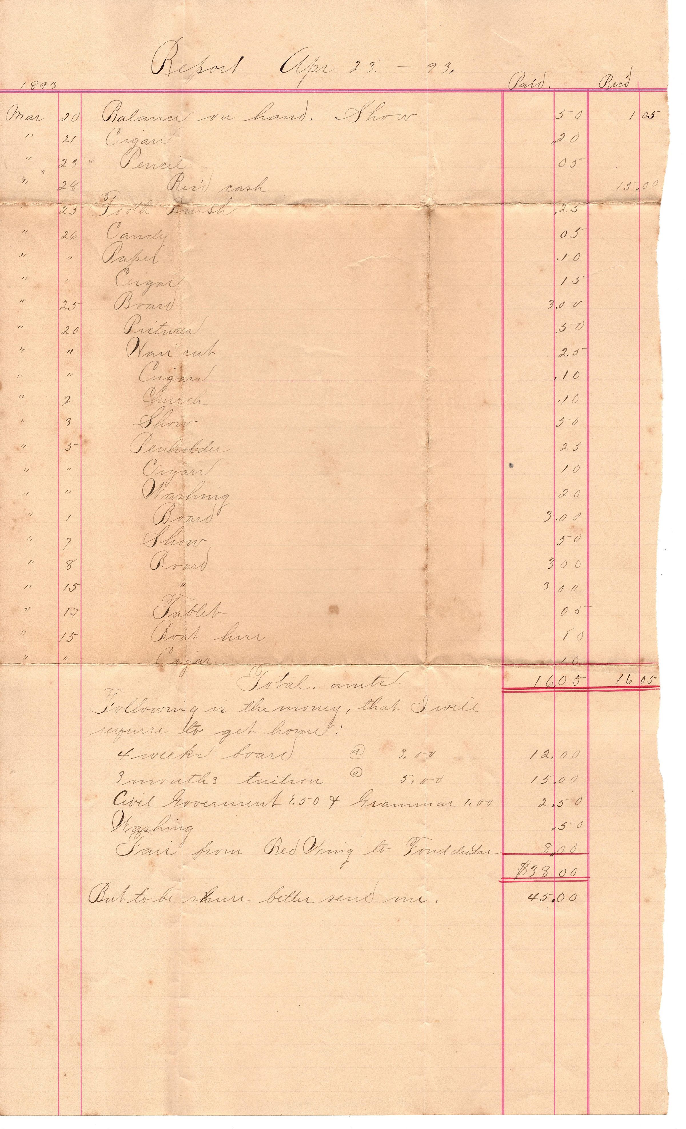 List of expenses written on ledger paper starting March 20 through April 23, 1893. The title is "Report Apr 23-93" and the list includes cigar, pencil, tooth brush, candy, paper, pictures, hair cut, etc. At the bottom is a small note that reads "Following is the money that I will require to get home: 4 weeks board @ 3.00, 3 months tuition @ 5.00, Civil Government 1.50 and grammar 1.00, Washing, Fair from Red Wing to Fond du Lac, But to be shure better send me 45.00". This is most likely a letter from Archie to his Father because it is on the same paper, same hand writing and similar items purchased.Collection