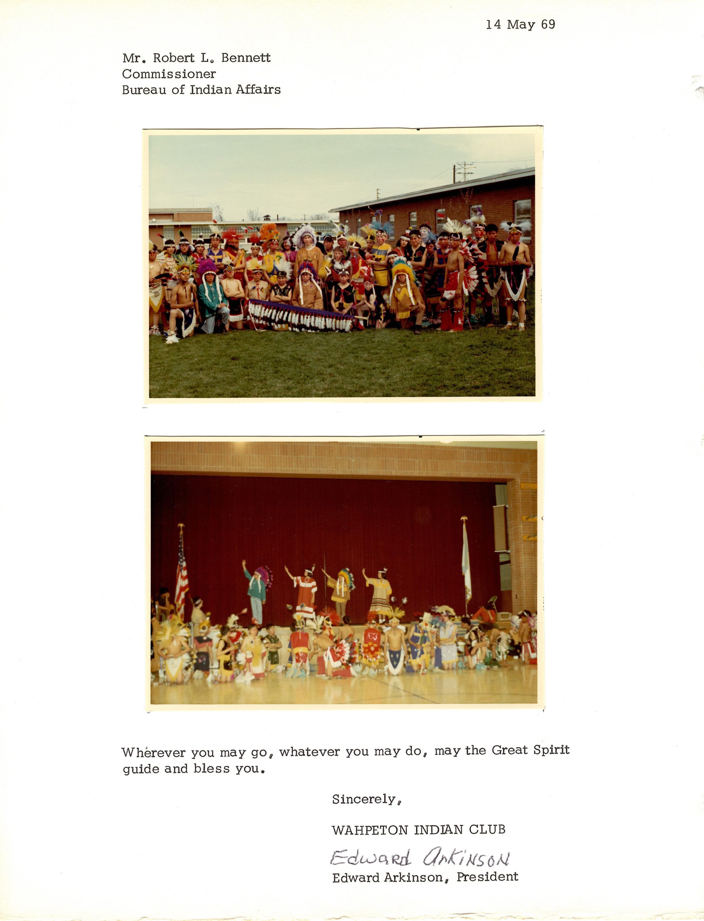 Colored photos taped to a sheet of paper. The sheet of paper has a heading that reads "Mr. Robert L. Bennett, Commissioner, Bureau of Indian Affairs. 14 May 69" and at the bottom reads "Wherever you may go, whatever you may do, may the Great Spirit guide and bless you. Sincerely, Wahpeton Indian Club, Edward Arkinson, President". The two photos are of a group of kids dressed in Native style clothing (headdresses, headbands with a feather, buckskin, etc.). The top photo is of them outside taking a picture with a banner of feathers in the front. The bottom photo is of four kids on stage while the rest are on the floor in front. The four on stage all have their right arms reaching up and looking to the right.Photograph Details
