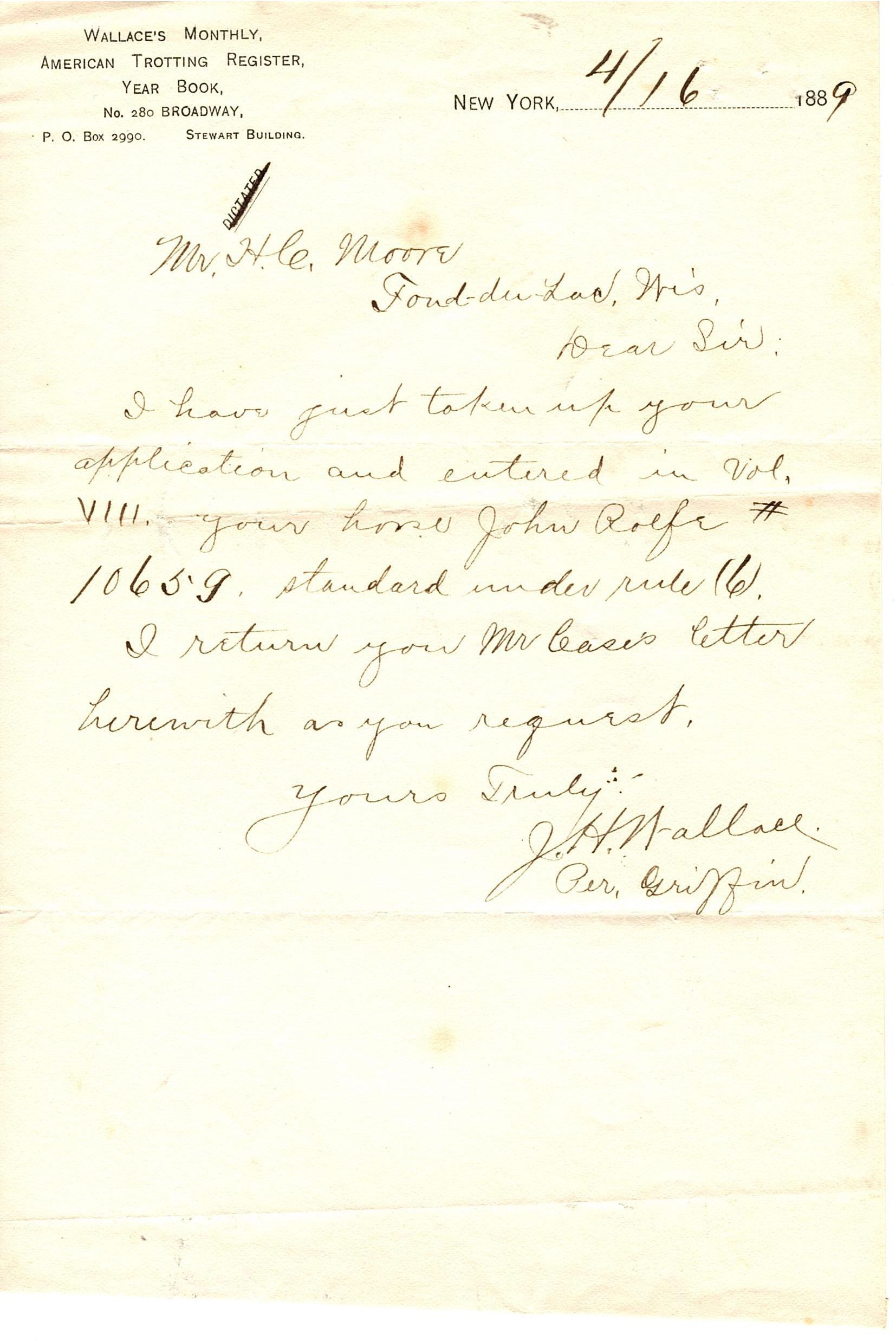 Sheet of paper with printed header that reads "Wallace's Monthly, American Trotting Register, Year Book, No. 280 Broadway, P.O. Box 2990, Stewart Building." It is dated 4/16 1889 (April 16, 1889) and reads "Mr. H. Moore, Fond du Lac, Wis., Dear Sir: I have just taken up your application and entered in col. VIII your ho-- John Roefe #10659 standard under rule (6). I return your Mr. Cases letter herewith as you request. Yours Truly, J.H. Wallace, Per. Griffin."Collection