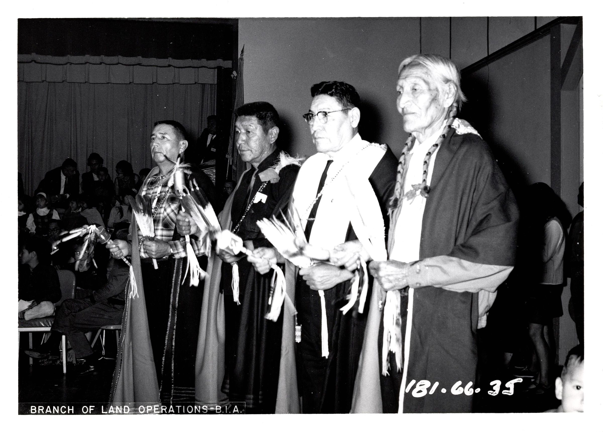 Black and white photograph of four men standing holding rattles and feather fans with shawls or blankets draped over their shoulders. Typed in bottom left corner "Branch of Land Operations - B.I.A." and written in white on opposite corner "181-66-35". Typed on the back "Walter Hamilton; Harvey Twins; Clarence Stoneroad; James Nightwalker Sr.".Photograph Details