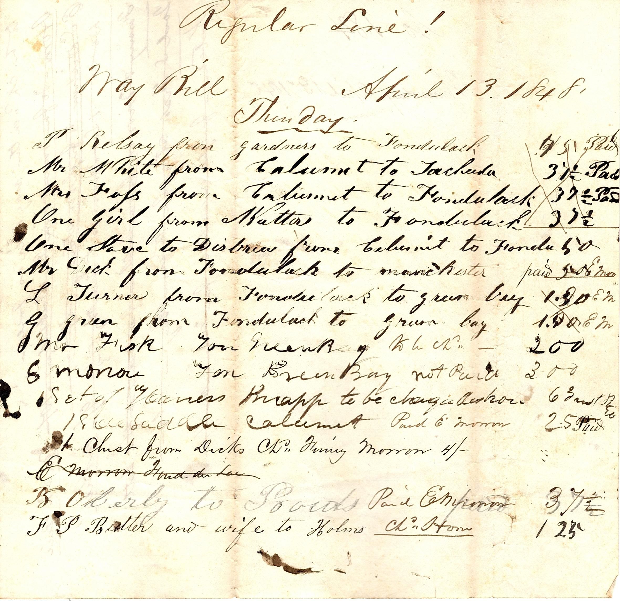 Partial sheet of paper with waybill written in black ink. The front reads "Regular Line!" at the top and then "Way Bill April 13 1848, Thursday" followed by a list of people and prices. The back cover page reads "No 184, Thursday April 13 1848" with seven lines of writing along the right edge, written sideways from the cover page. The bottom six lines have been crossed off.Collection