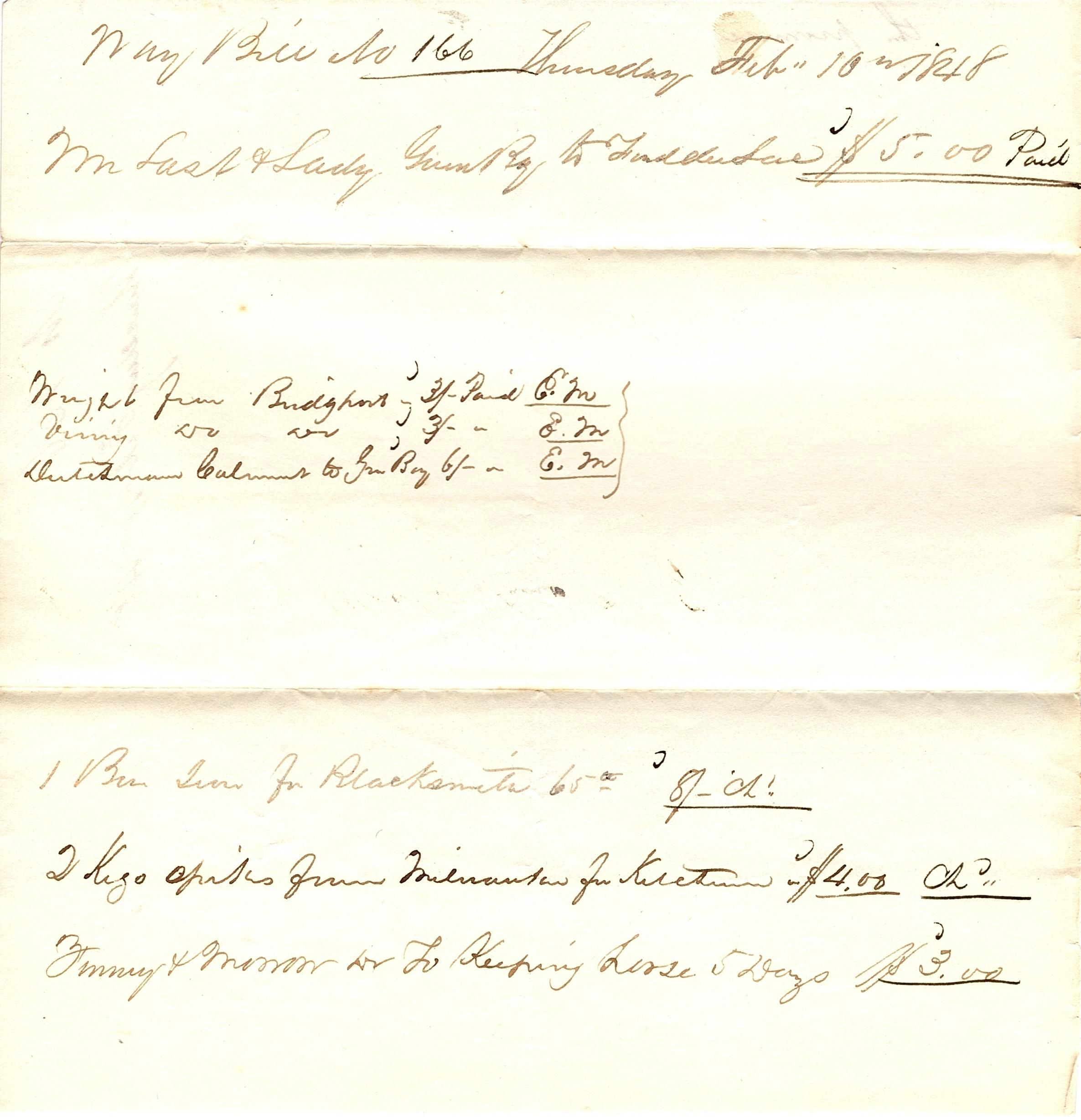 Partial sheet of paper with waybill written in black ink. The bill begins "Way Bill No 166 Thursday Feb 10th 1848" on the front and the cover page on the back reads "No 166, Thursday Feb 10 48" there are two words written in the bottom left corner on the cover page side, written sideways in comparison to the cover page, that read "the promise".Collection