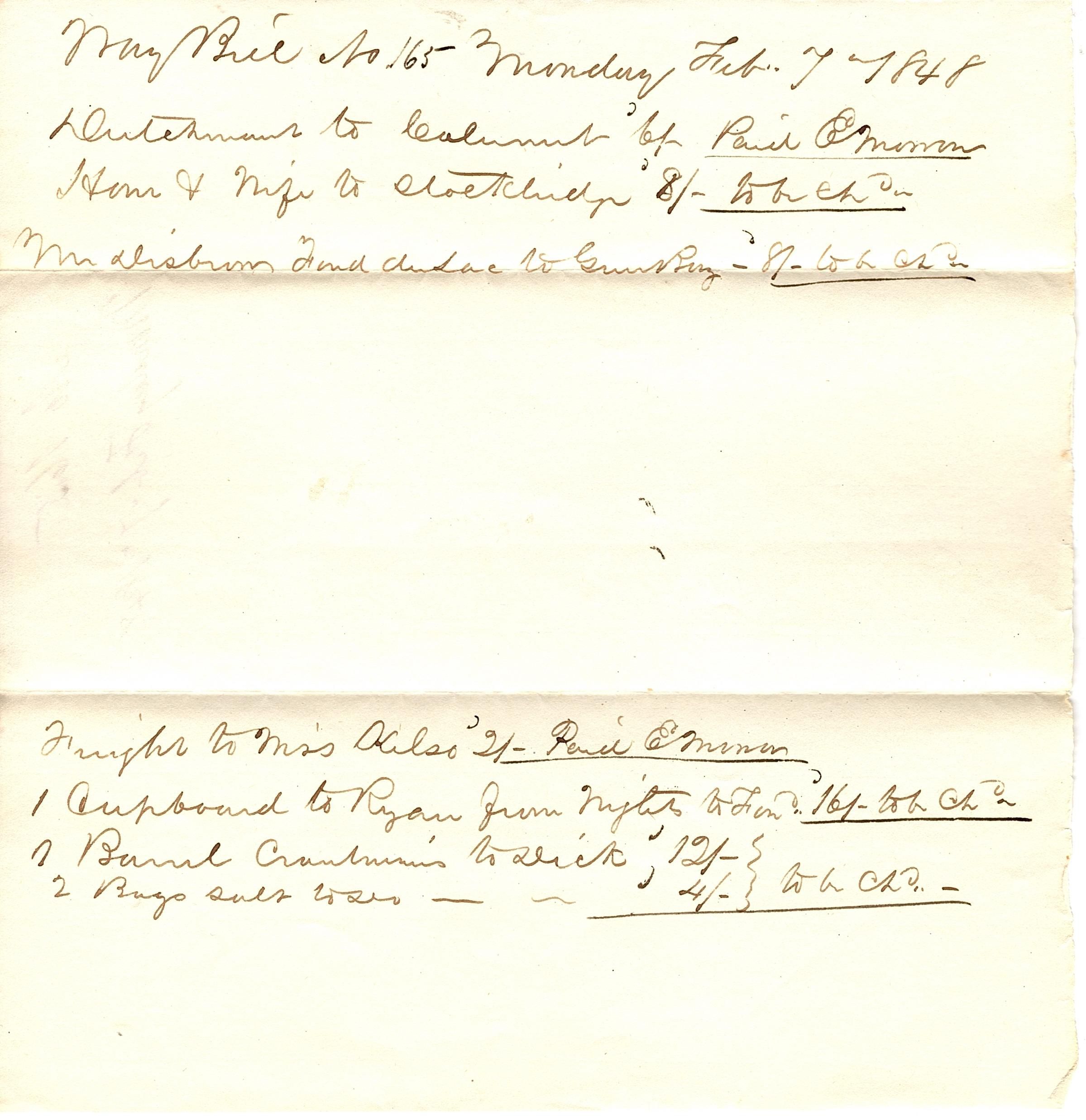 Partial sheet of blank paper with a waybill written in black ink on it. The bill starts "Way Bill No 165 Monday Feb 7 1848". The back side is a cover page that reads "No 165, Monday Feb 7 1848".Collection