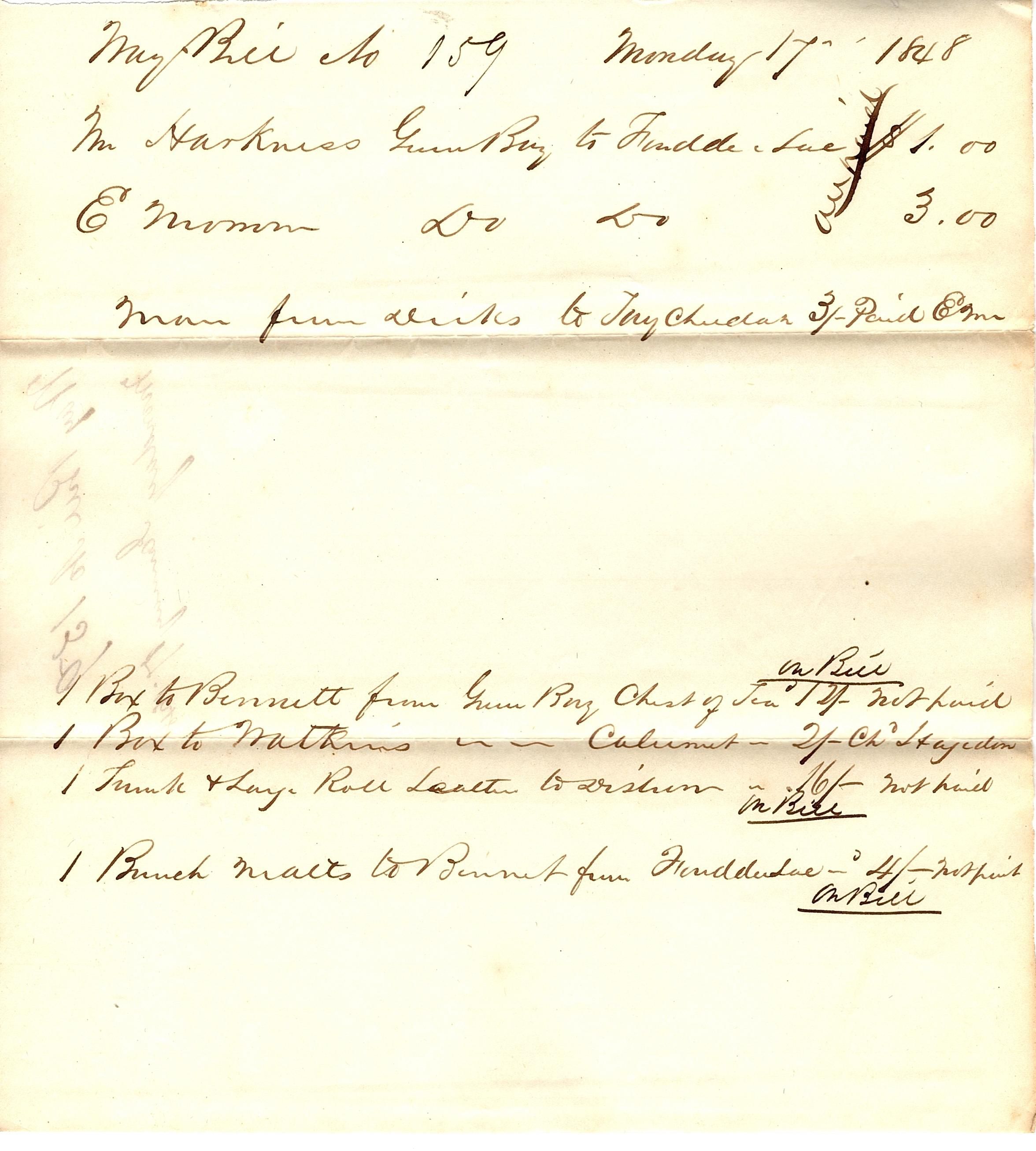 Partial sheet of paper cut or torn along the top, used as a Waybill that reads "Way Bill No 159 Monday 17 1848". The back cover page reads "Way Bill No 159, Monday January 17 1848. The bill is written in black ink.Collection