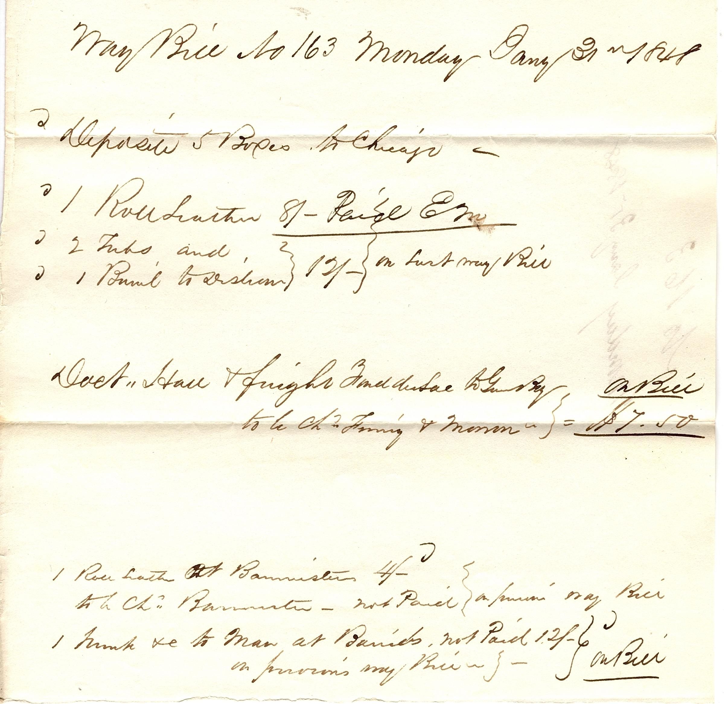 Partial sheet of paper used as a Way Bill and written in black ink. The bill starts "Way Bill No 163 Monday Jany 31st 1848" and continues with the details on the front. The back has a cover page that reads "No 163, Monday Jany 31 1848".Collection