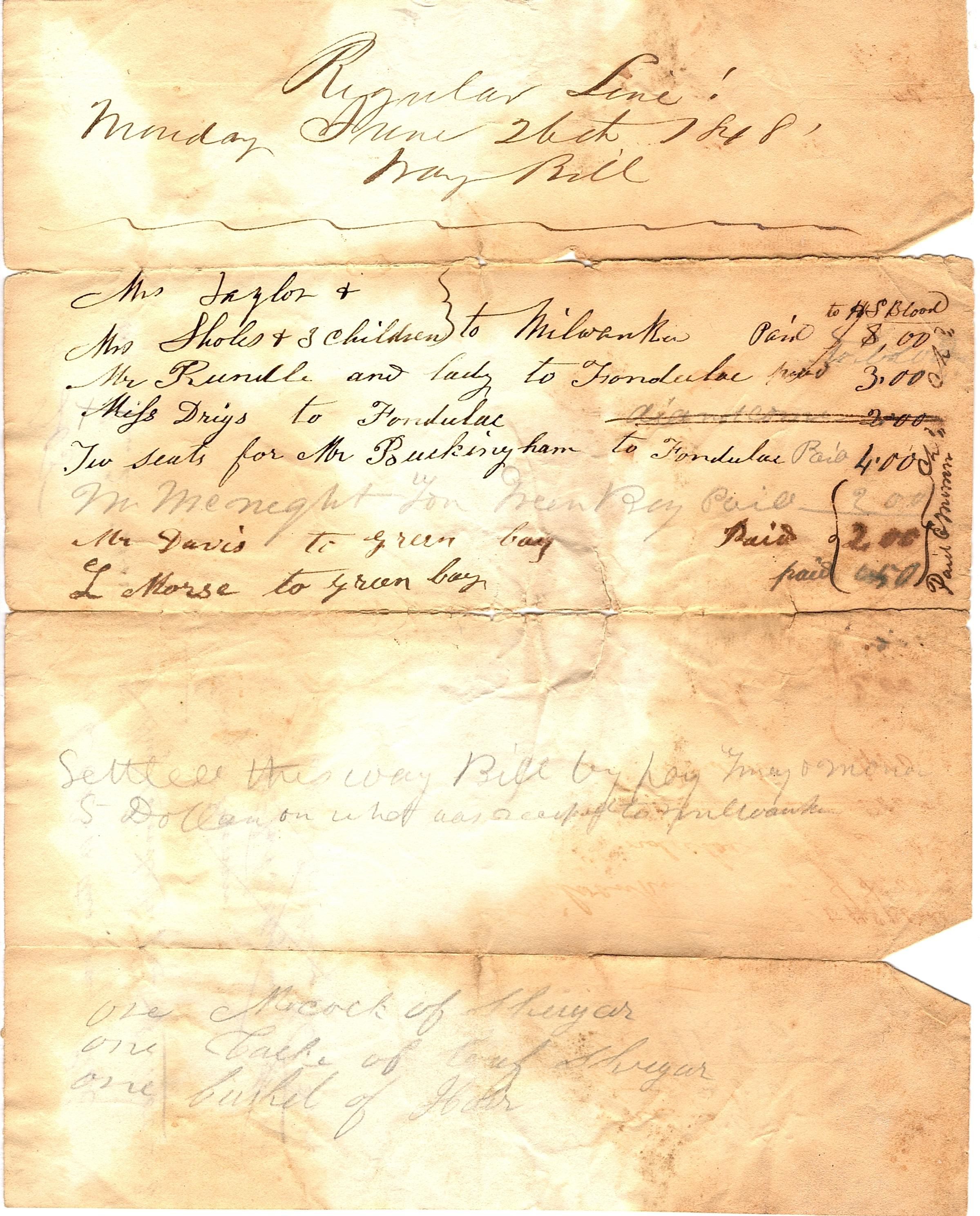 Single sheet of cream paper with waybill written in black ink. The bill starts "Regular Line!, Monday June 26th 1848, Way Bill" followed by five lines of black ink, one line of pencil, two lines black ink, and the bottom two sections are written in pencil. The back cover page reads "No 203, Monday June 26 1848" and to the right are five lines written in black ink with the bottom four X'd out and in the bottom right corner are calculations in pencil.Collection