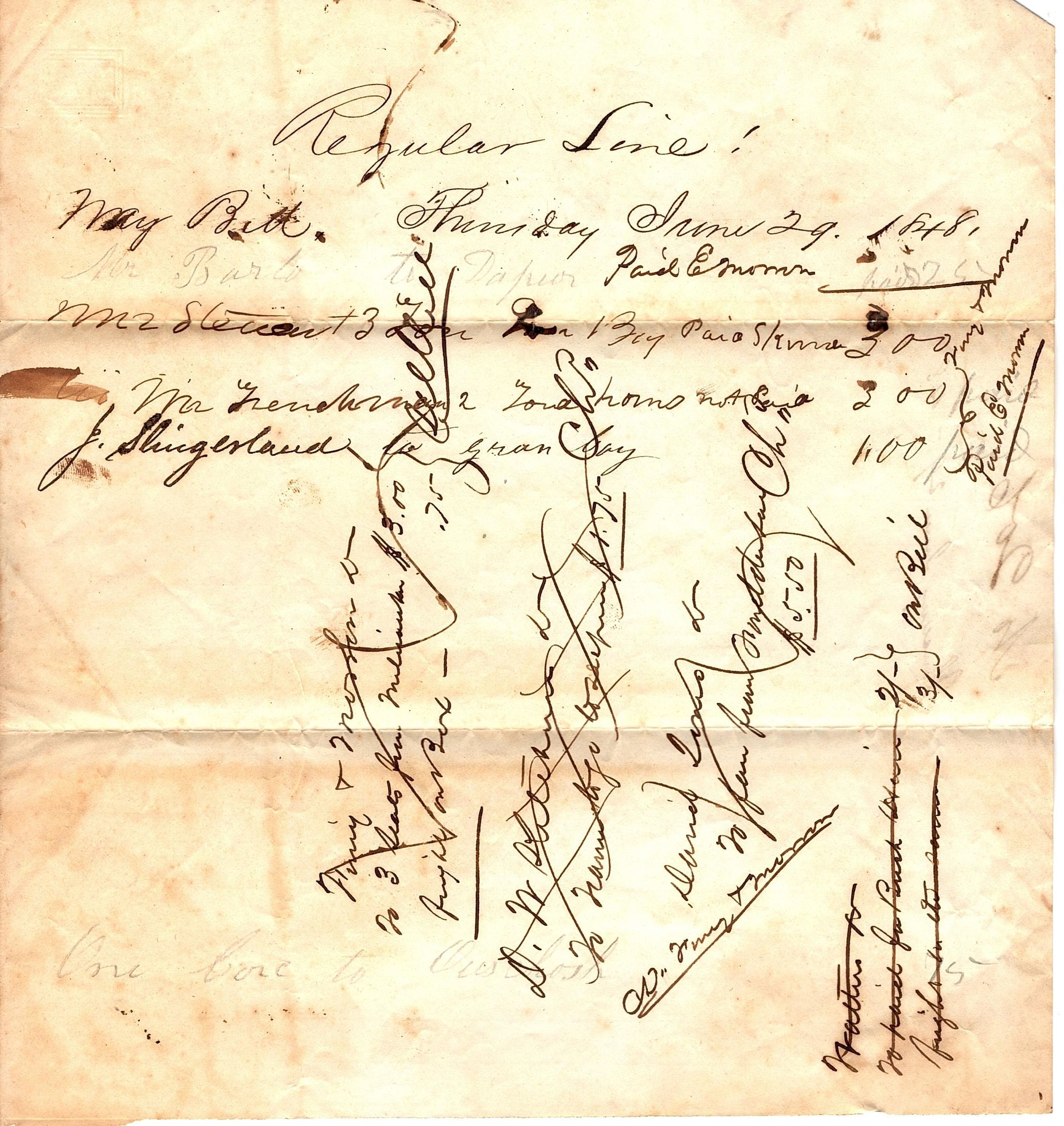 Partial sheet of paper used as a waybill written in black ink. The bill starts "Regular Line!, Way Bill Thursday June 29 1848". There are three lines in black ink below the header and a list at the bottom written sideways, most of which is either X'd out or crossed out. The back cover page reads "No 206, Thursday June 29 -48".Collection