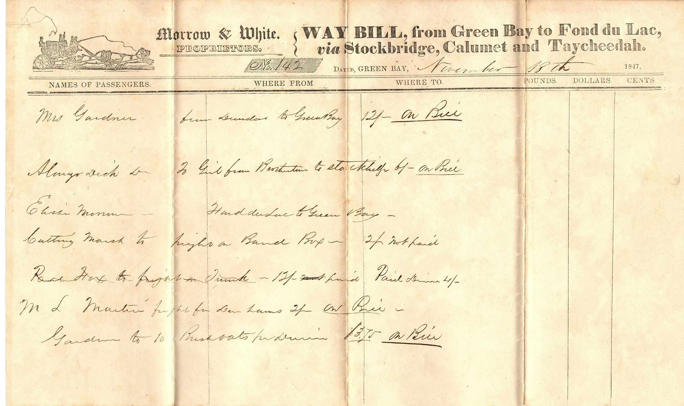 Legal sized sheet of paper with Morrow & White, Proprietors letterhead that also reads "Way Bill, from Green Bay to Fond du Lac, vis Stockbridge, Calumet and Taycheedah". There are six columns: Names of passengers, Where from, Where to, Pounds, Dollars, and Cents." It is filled our in black ink. In the top left corner is an image of a stagecoach with four horses pulling it. It is dated November 18th on the front. Written on the back in black ink: No 142, Thursday Nov 18 1847.Collection