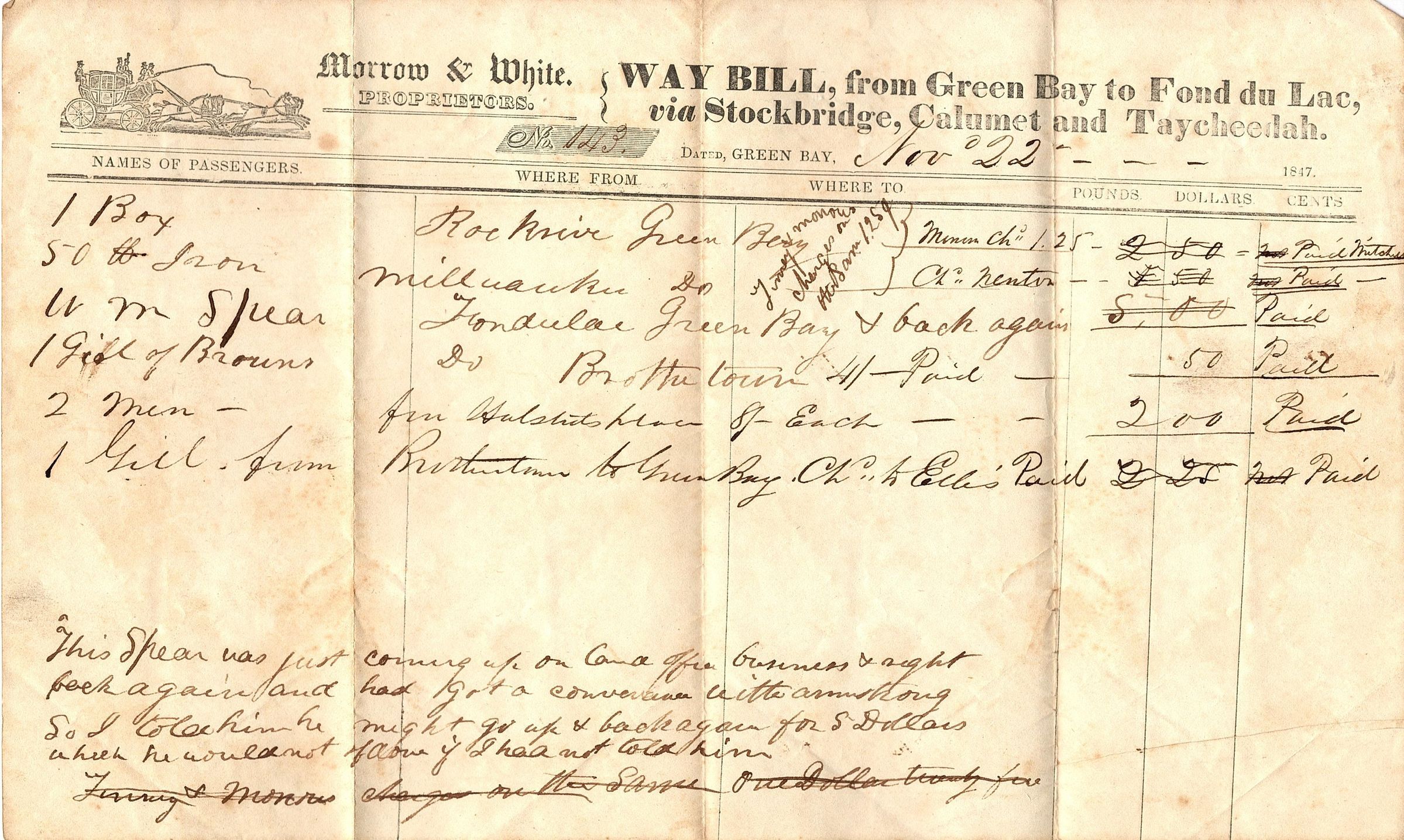 Legal sized sheet of paper with Morrow & White, Proprietors letterhead that also reads "Way Bill, from Green Bay to Fond du Lac, vis Stockbridge, Calumet and Taycheedah". There are six columns: Names of passengers, Where from, Where to, Pounds, Dollars, and Cents." It is filled our in black ink. In the top left corner is an image of a stagecoach with four horses pulling it. It is dated Nov 22 on the front. Written on the back in black ink: No 143, Nov 22 1847.Collection