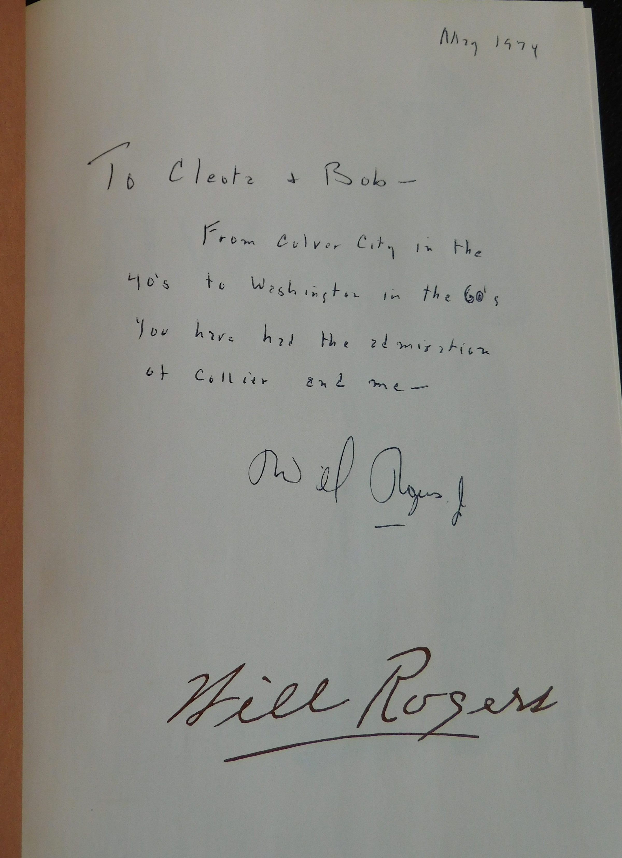 May 1974 To Cleota & Bob-From Culver City in the 40s to Washington in the 60's you have had the admiration of Collier and me. Will Rogers, Jr.Other Names and Numbers