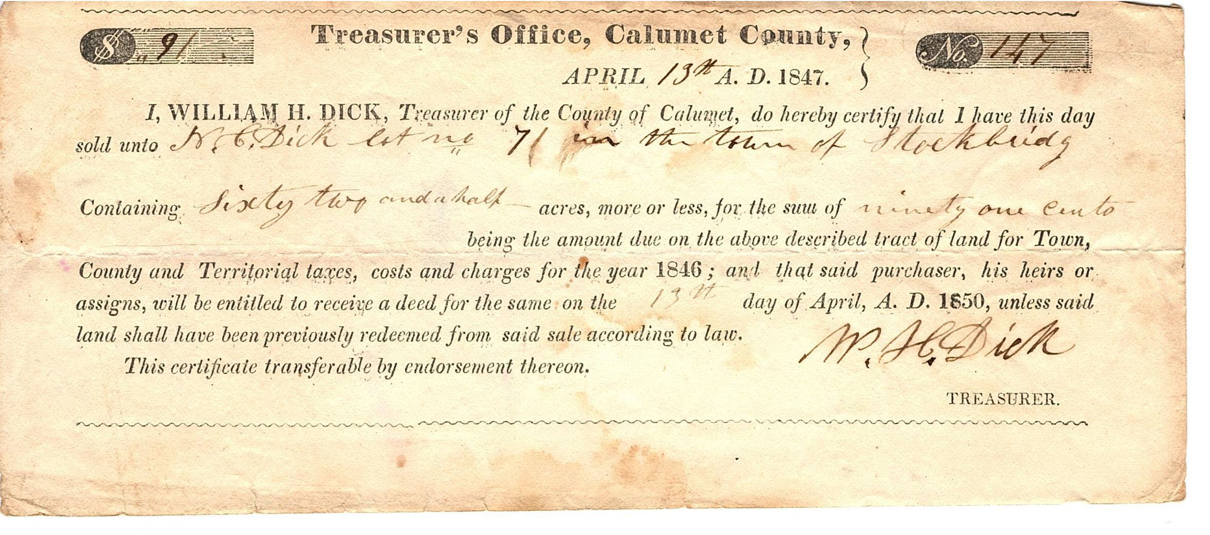 Small piece of paper printed and filled in with black ink that reads "Treasurer's Office, Calumet County, April 13th A.D. 1847". This particular receipt is No. 147 and was worth $.90. It certifies that William H. Dick (treasurer) sold H. C. Dick lot no 71 in Stockbridge (62.5 acres) for "ninety one cents".Collection