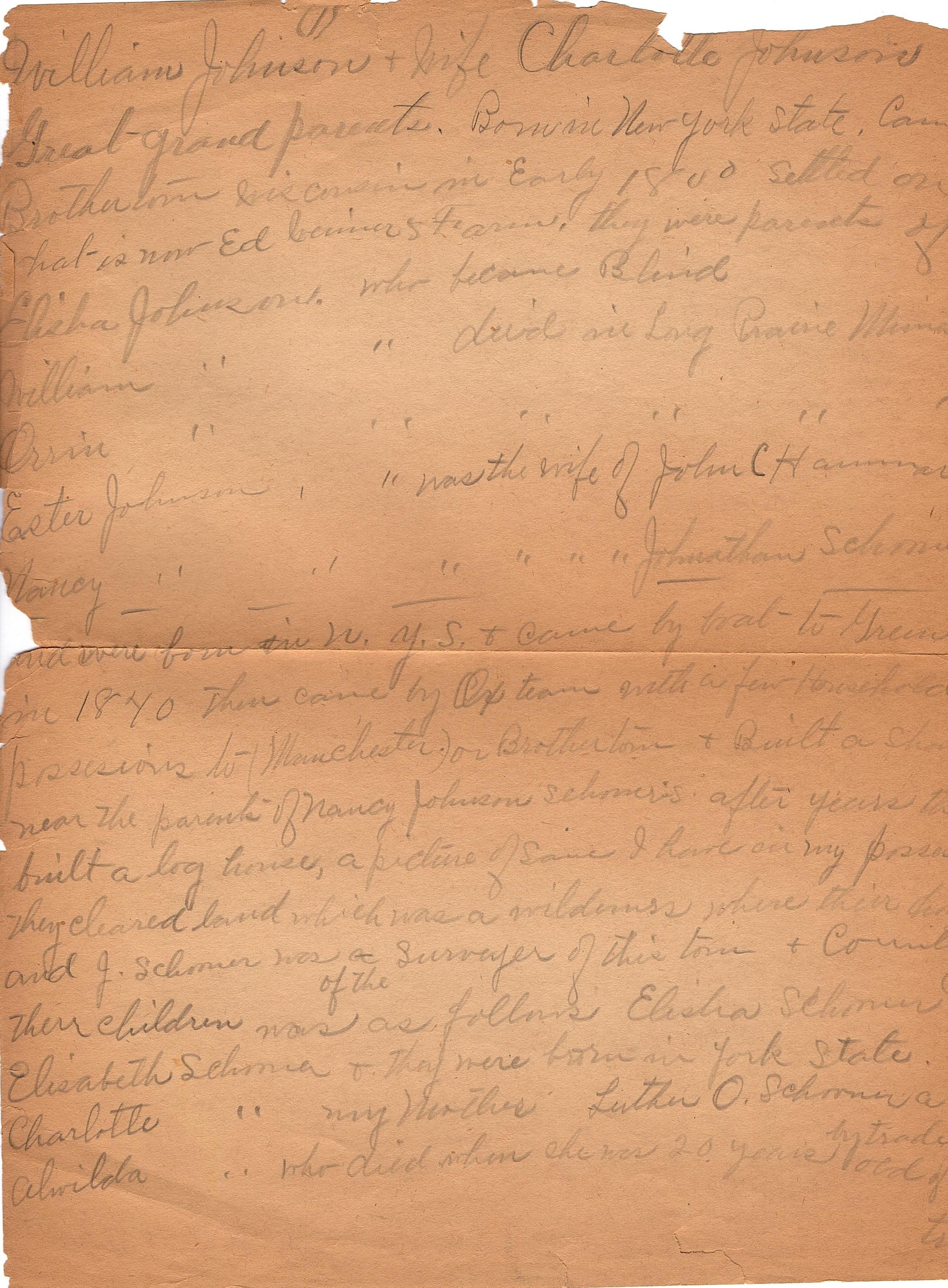 Two brittle pieces of brown paper with handwritten genealogy notes in pencil. The notes start "William Johnson and wife Charlotte Jonson, Great-grandparents, born in New York State, Came to Brothertown Wisconsin in Early 1800..."Collection
