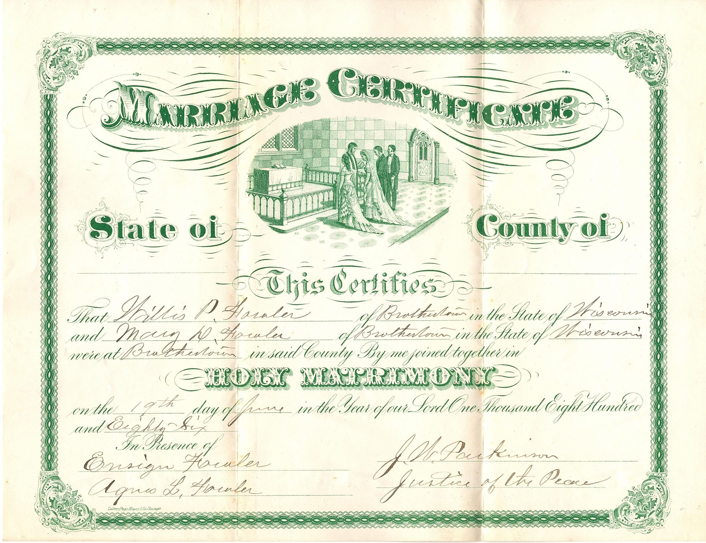 Marriage certificate between Willis P. Fowler and Mary D. Fowler of Brothertown, Wisconsin. Witnesses included: Ensign Fowler and Agnes L. Fowler. They were married June 19th 1886 in front of J.W. Parkinson, Justice of the Peace. The border is green with an image of two people getting married with two witnesses and a Justice of the Peace in the top, center.Collection