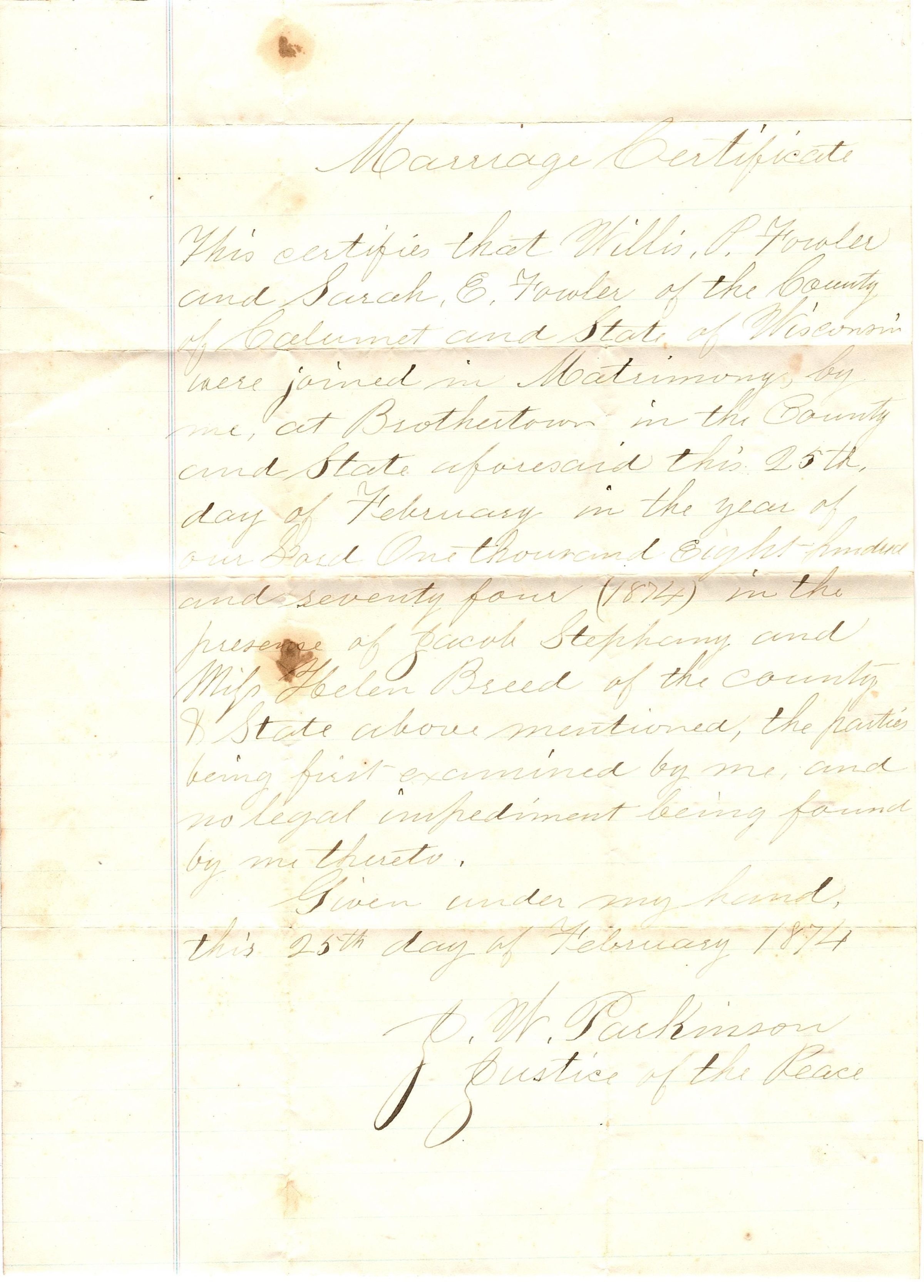 Handwritten marriage certificate on a single sheet of lined paper. The marriage was between Willis P. Fowler and Sarah E. Fowler of Calumet County on Feb. 25, 1874 and signed by F.W. Parkinson, Justice of the Peace.