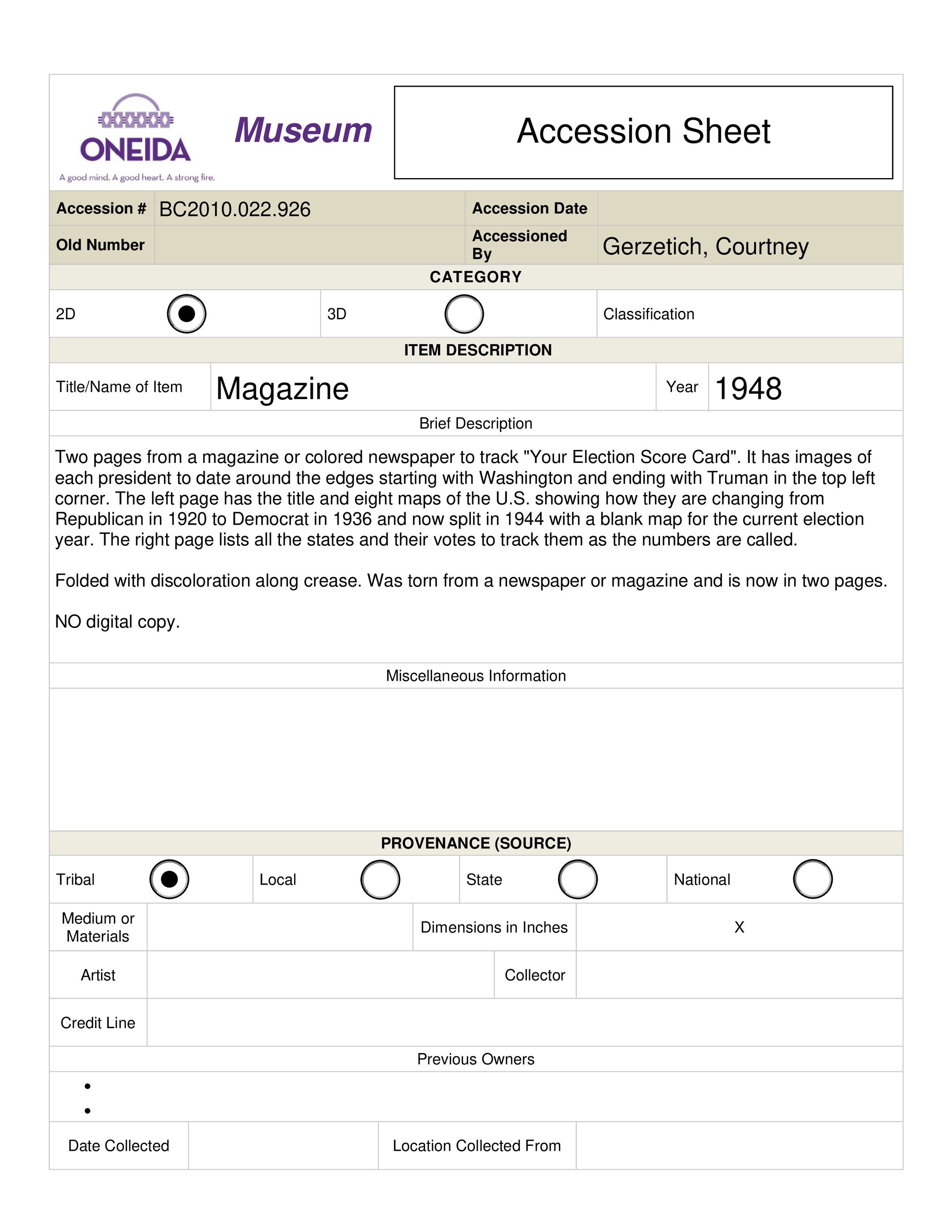 Two pages from a magazine or colored newspaper to track "Your Election Score Card". It has images of each president to date around the edges starting with Washington and ending with Truman in the top left corner. The left page has the title and eight maps of the U.S. showing how they are changing from Republican in 1920 to Democrat in 1936 and now split in 1944 with a blank map for the current election year. The right page lists all the states and their votes to track them as the numbers are called.Collection