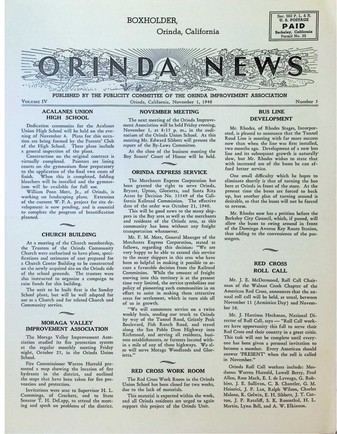 The Orinda News focuses on local events and news that is of interest to residents and businesses of Orinda. The Orinda News has been a monthly publication since 1937, providing news and information to the Orinda community. The Orinda Association (previously Orinda Improvement Association) publishes the newspaper, which is mailed to every household and business in Orinda.Publication Details