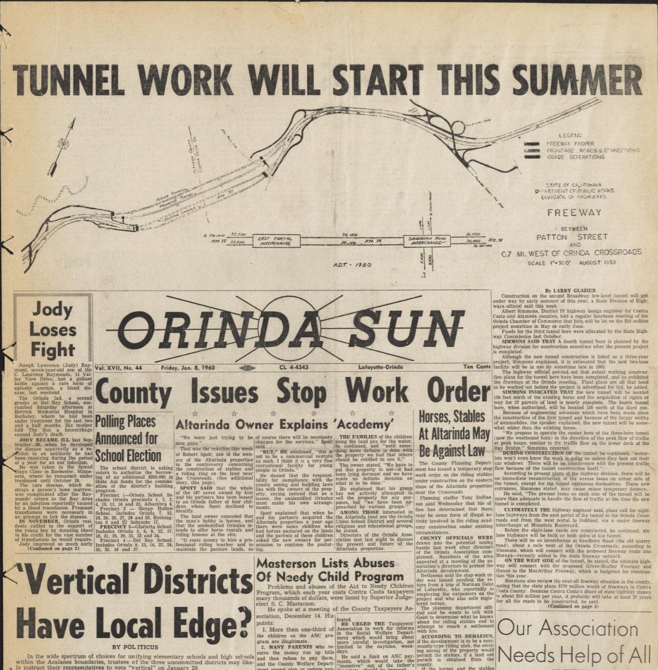 This is a bound book of newspapers that were published by the Orinda Sun in 1960. Orinda Sun Newspapers from 1948 to 1963 are available online at the California Revealed website or on the Internet Archives where a text search for keywords can be done using advanced search.Context