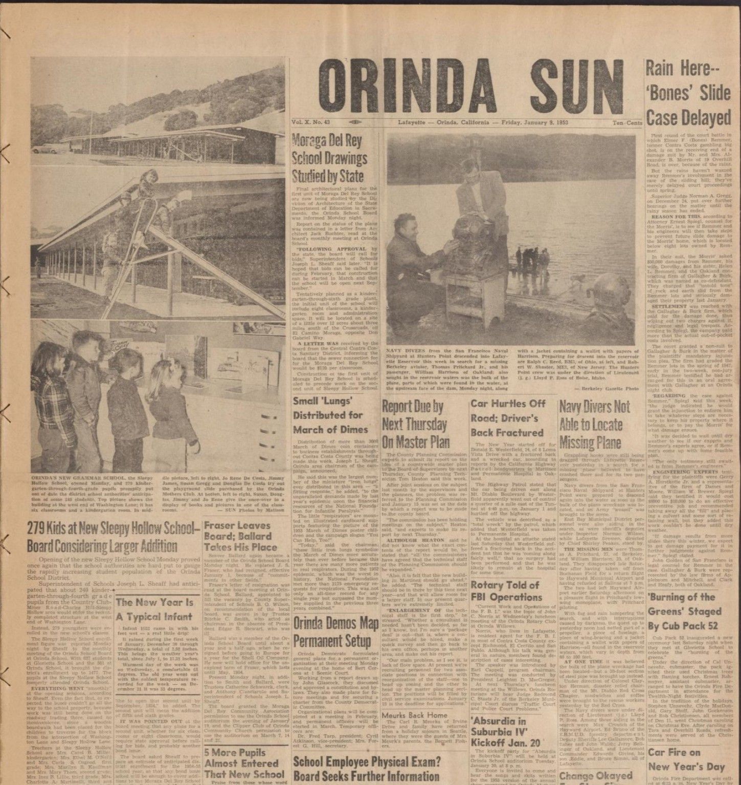 While the Orinda Sun newspapers primarily reported on local area news, it would sometimes cover national, California or Contra Costa County stories as well. Despite the Orinda Sun's main focus being Orinda, it would often cover greater Lamorinda area(Lafayette, Moraga & Orinda) topics like: local development projects, schools, politics, crime, social events, want ads, obituaries, wedding & birth announcement and ads for local establishments. These newspapers reflect the culture of the people who settled and lived in Orinda, California and the surrounding communities in the 1950s.Publication Details