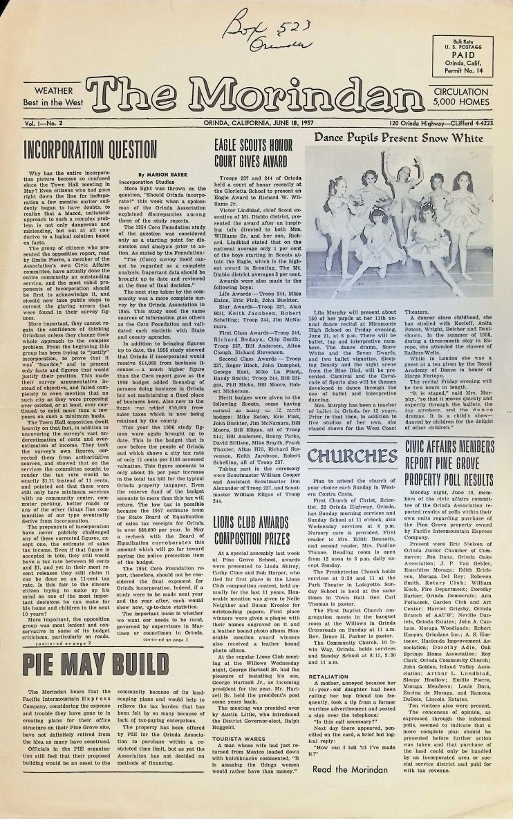 The Morindan was a weekly community newspaper published in Orinda, California in 1957, serving the growing suburban communities of Orinda and Moraga with local news, business advertisements, social announcements, and coverage of civic issues including the town's incorporation discussions.Context