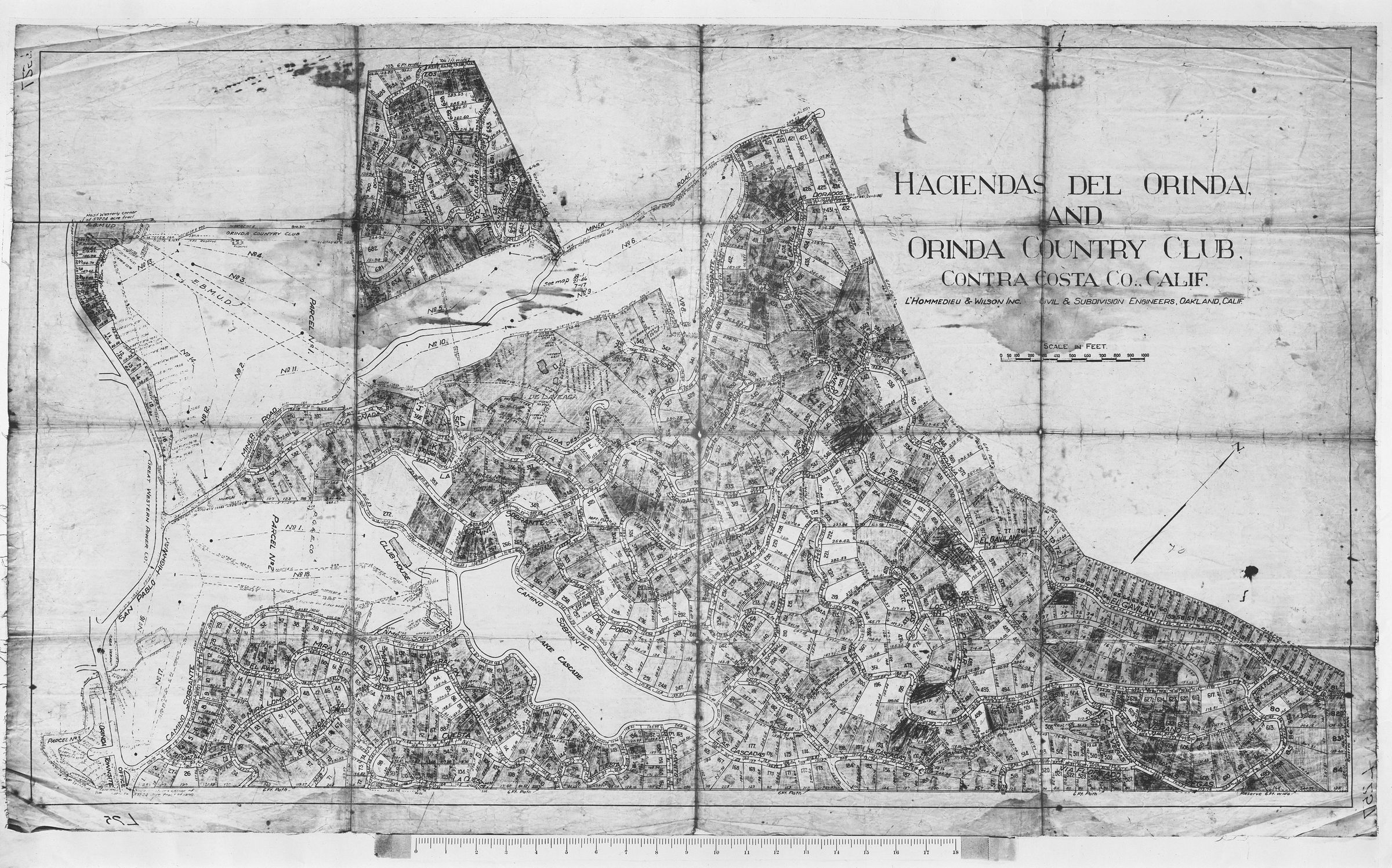 The image is a photocopy of a detailed, old map titled "Haciendas del Orinda and Orinda Country Club, Contra Costa Co., Calif." It is intricately drawn and features a variety of plotted areas, likely representing land parcels or estates, demarcated by boundaries and labeled numerically. The map's design includes numerous curved and intersecting lines indicating roads or pathways, with areas shaded differently to distinguish various sections or features of the land. The map is annotated with the names of engineering firms involved in its creation, specifically "L'Hommedieu & Wilson Inc., Civil & Subdivision Engineers, Oakland, Calif." A scale in feet is provided for reference, and topographical elements suggest a landscape of varied elevation or vegetation.Other Name