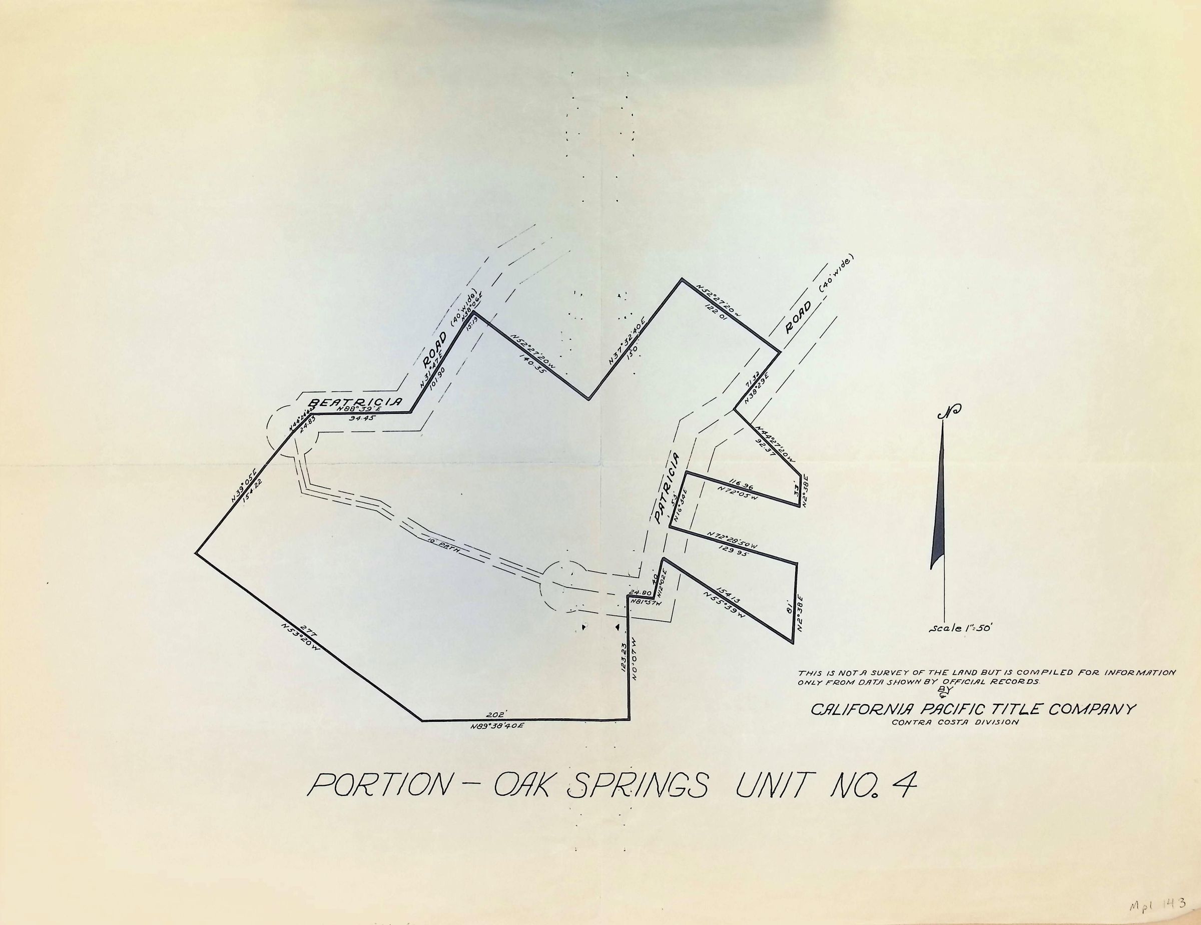 The image depicts a land map titled "Portion - Oak Springs Unit No. 4," prepared by the California Pacific Title Company, Contra Costa Division. The map outlines a specific section of land with distinct boundary lines and is labeled with notations indicating areas labeled as "BEATRICIA" and "PATRICIA." Various roads and coordinates are marked, providing dimensions and directions. A north arrow at the right indicates the orientation, with a scale of 1" = 50'. A note clarifies that it is not an official survey but compiled from existing records. The map is primarily in black and white with clear linework and text annotations.