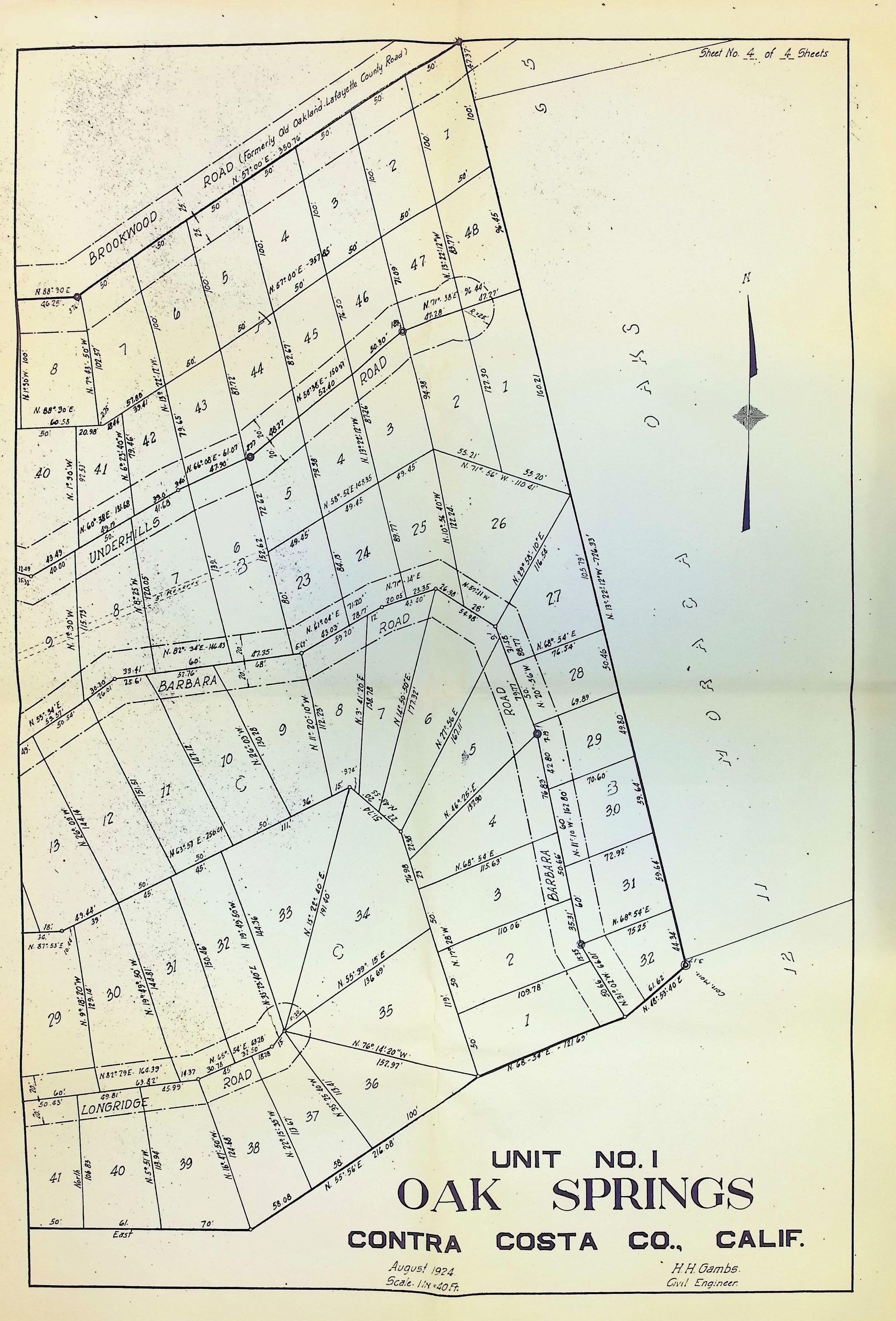 The image is a detailed map labeled "Oak Springs, Unit No. 1" in Contra Costa County, California, dated August 1924, and prepared by H.H Gambs, a civil engineer; the map delineates plots of land with boundary lines, numbers, and measurements, along with several roads intersecting the area, including roads labeled as Brookwood, Underhill, Barbara, and Longridge.