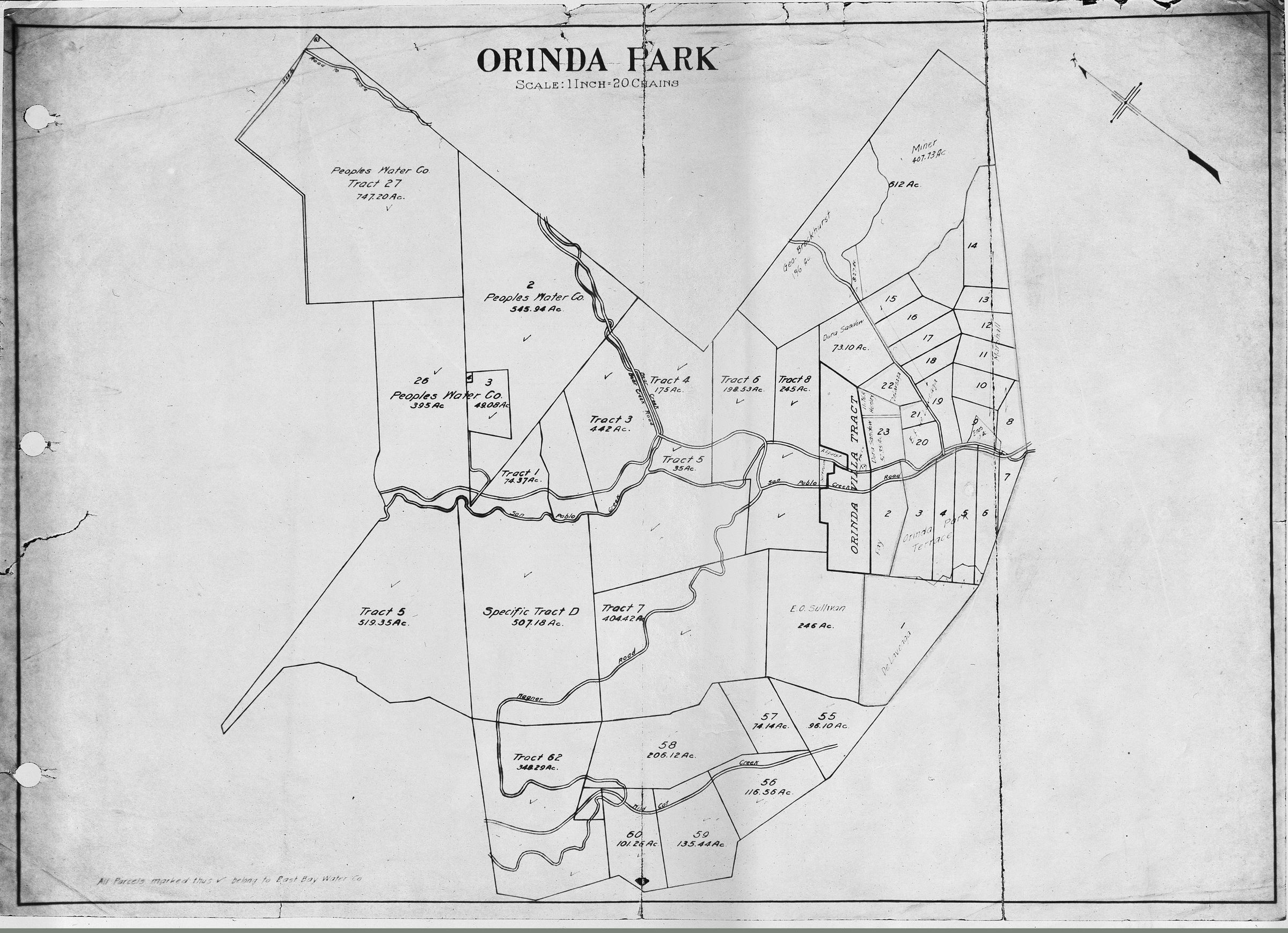 The image is a detailed map of Orinda Park with a scale of one inch equaling 20 chains. It showcases various tracts of land, each numbered and labeled with different acreage values, such as "People's Water Co Tract 27, 741.20 Ac." and "Tract 1, 579.4 Ac." The map is sectioned into various areas marked with distinct names and acreage, indicating different ownerships or leases. Tracts are irregularly shaped, likely reflecting natural land features. San Pablo Creek runs through the map. This historical map provides insights into land distribution and ownership during the period it represents, likely intended for legal, developmental, or planning purposes. Notable names recorded on the map include Peoples Water Co., Miner, Geo. Brockhurst, Dora Sandow, E. O. Sullivan, De Laveaga, Enos, Henley, Marshall, Fay, Wagner (road and creek).Other Name