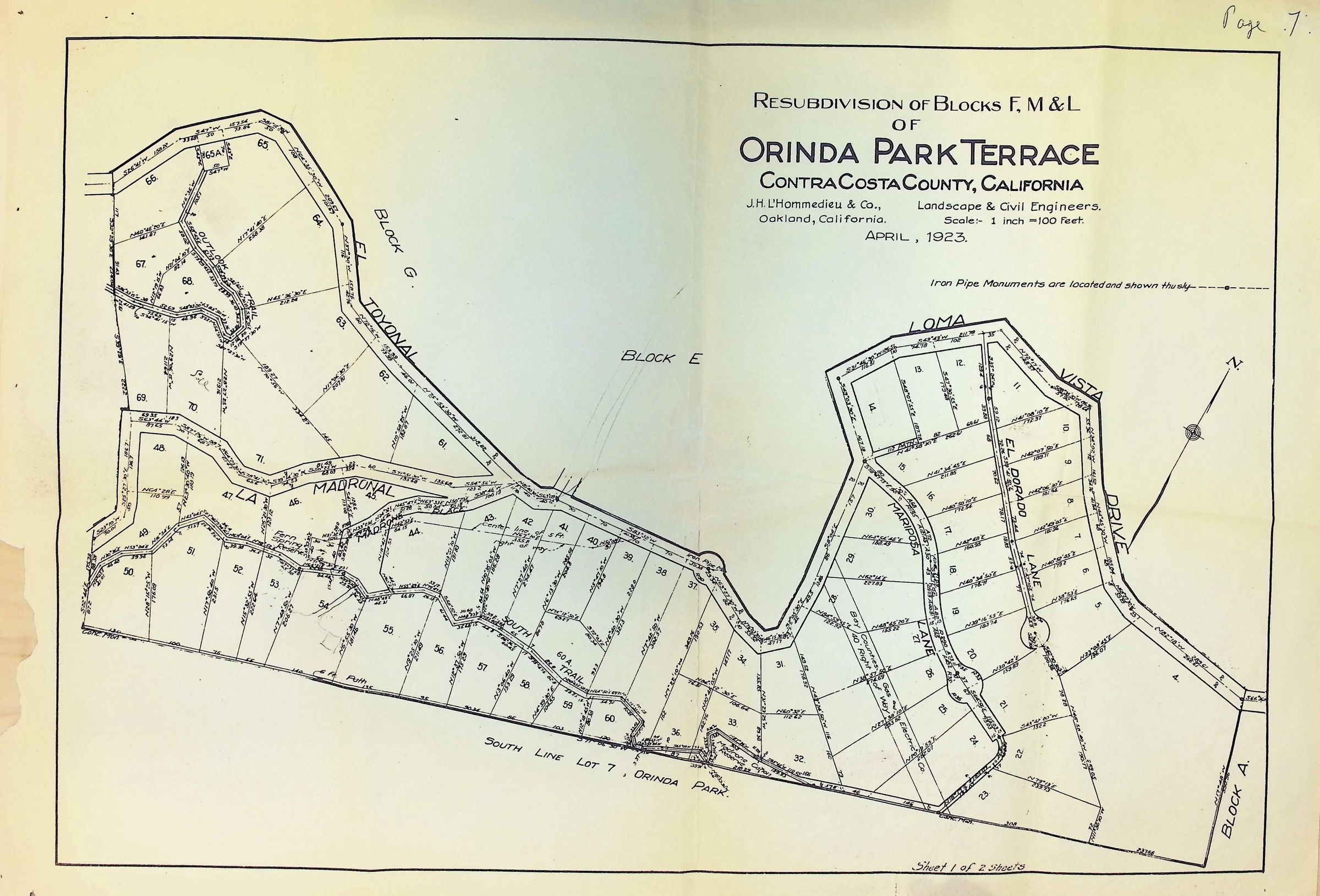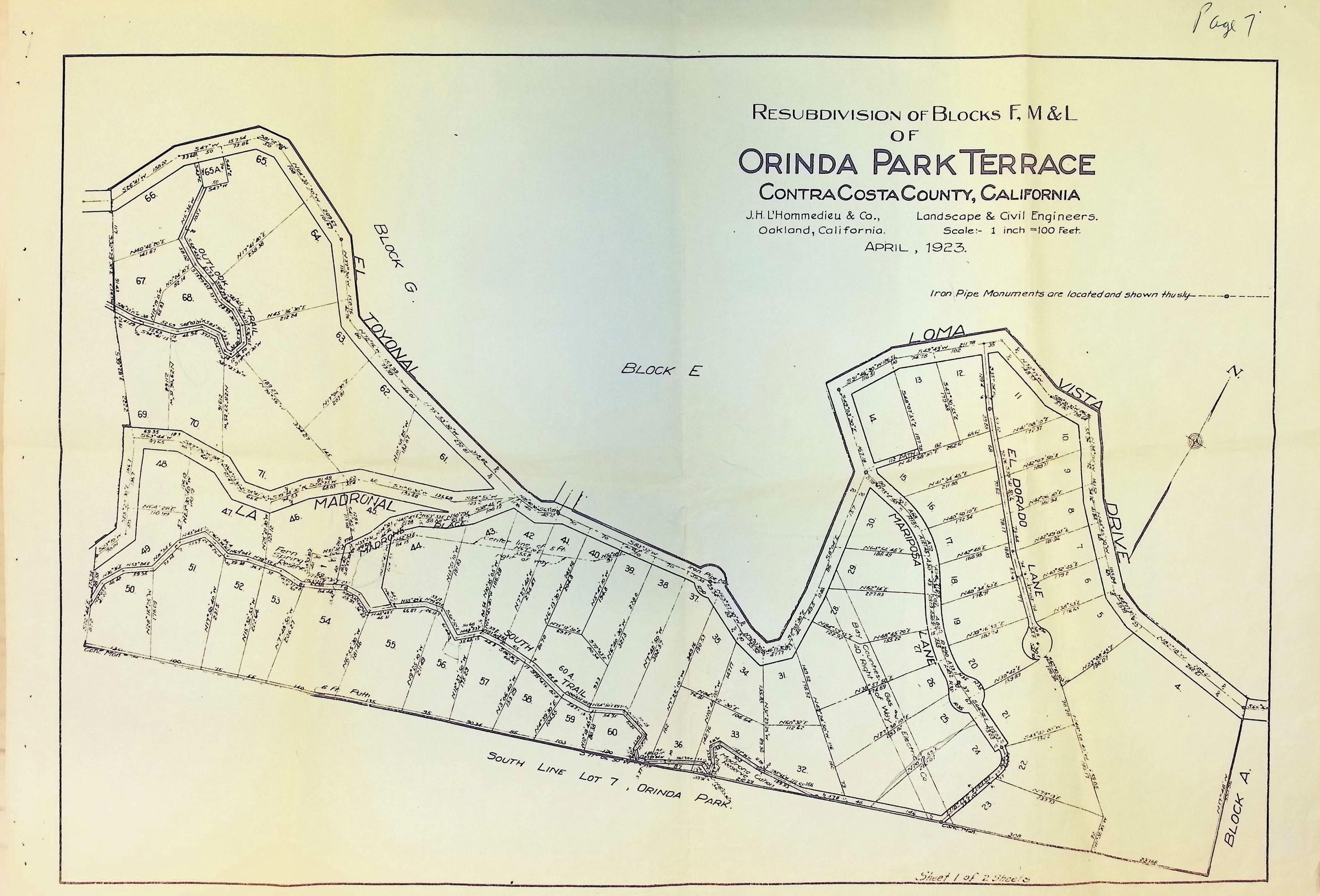 The image is a detailed survey map from April 1923, illustrating the resubdivision of Blocks F, M, and L of Orinda Park Terrace in Contra Costa County, California, created by J.H. L’Hommedieu & Co., civil and landscape engineers from Oakland; it delineates various plots with their respective lot numbers and boundaries, road names such as El Toyonal, Loma Vista, Mariposa, and La Madrinal.