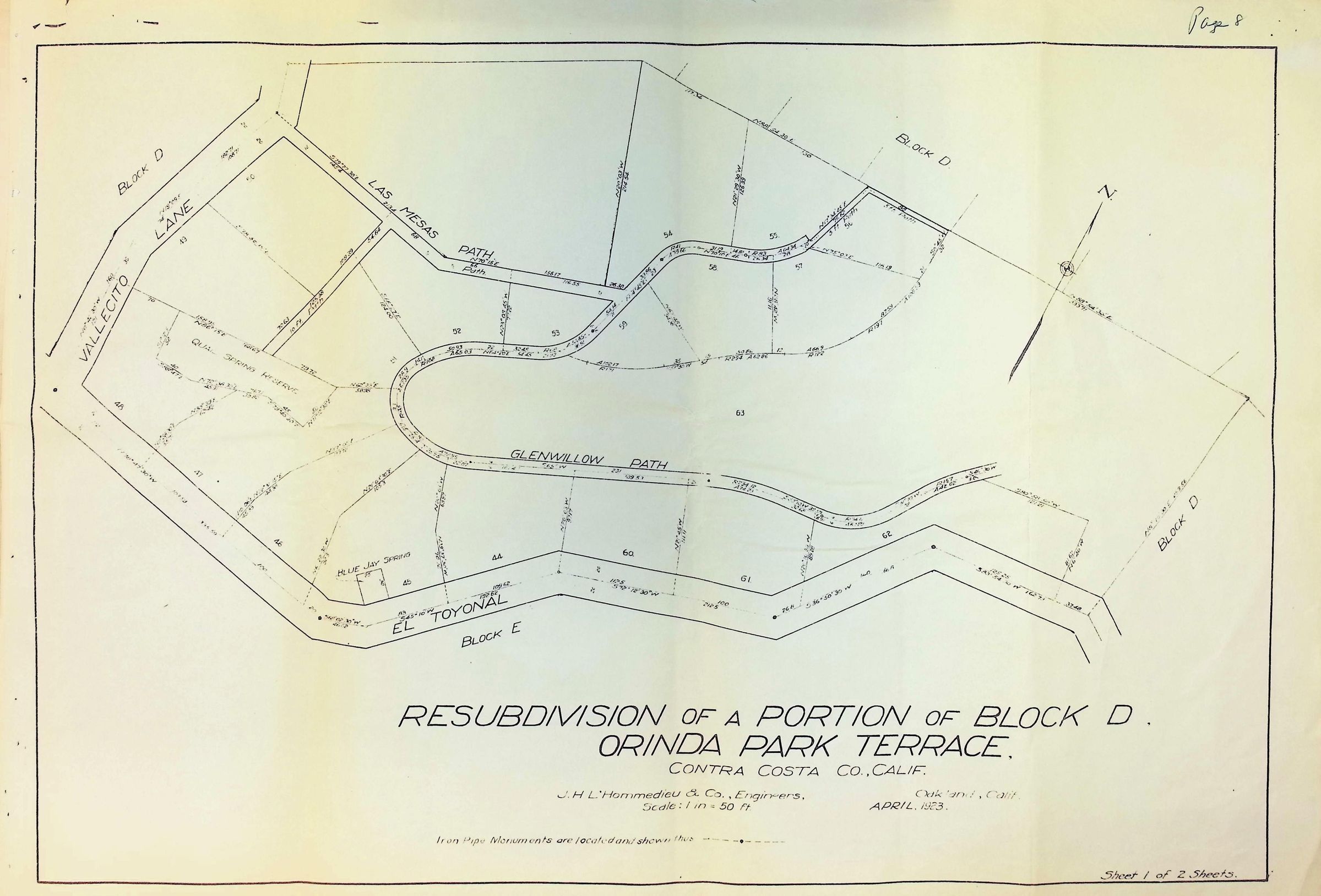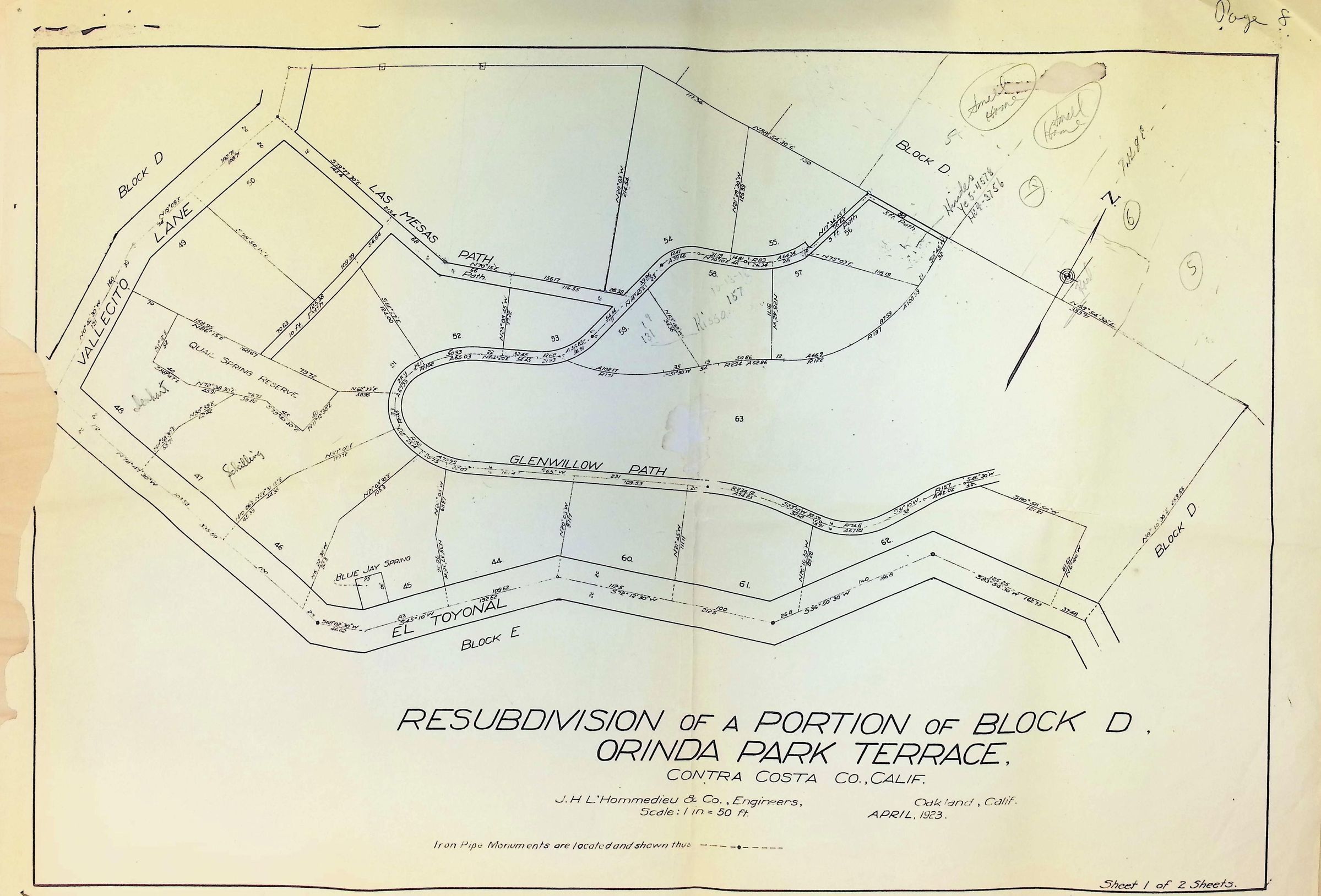 The image is a detailed plan of the resubdivision of a portion of Block D in Orinda Park Terrace, Contra Costa County, California, created by J.H. L’Hommedieu & Co. Engineers in April 1923, featuring plots labeled with numbers, and roads named El Toyonal, Vallecito Lane, Glenwillow Path, and Las Mesas Path, with a scale of 1 inch to 50 feet.