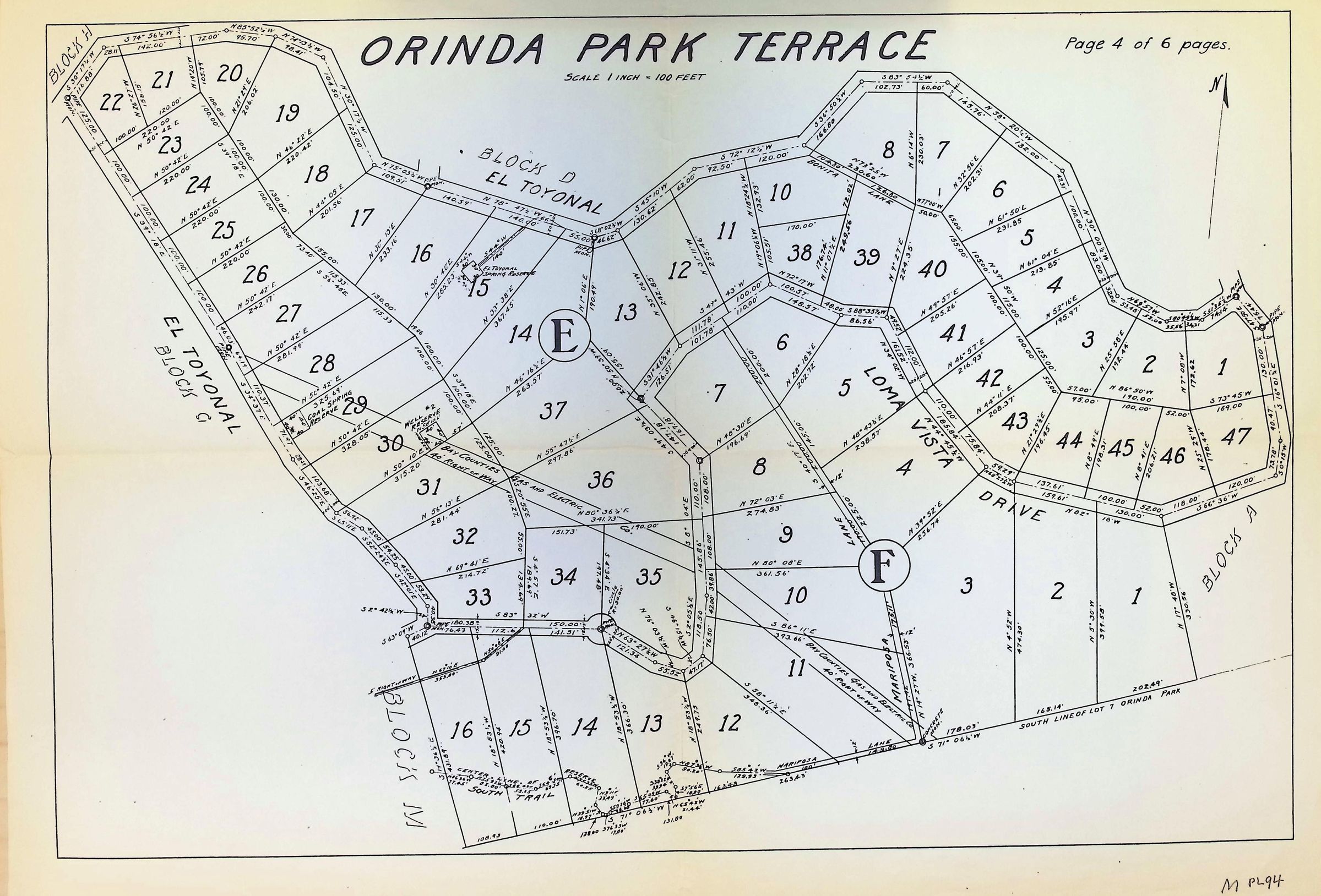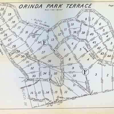 The image depicts a detailed map titled "Orinda Park Terrace" showing various numbered plots of land, each outlined with precise measurements along boundaries marked in different colors, with street names like El Toyonal and Loma Vista clearly indicated; notable features include circled letters E and F, and handwritten annotations in red, possibly denoting changes or additional information, with directional lines pointing north for orientation, and text on the upper right corner. 1922.