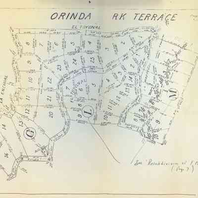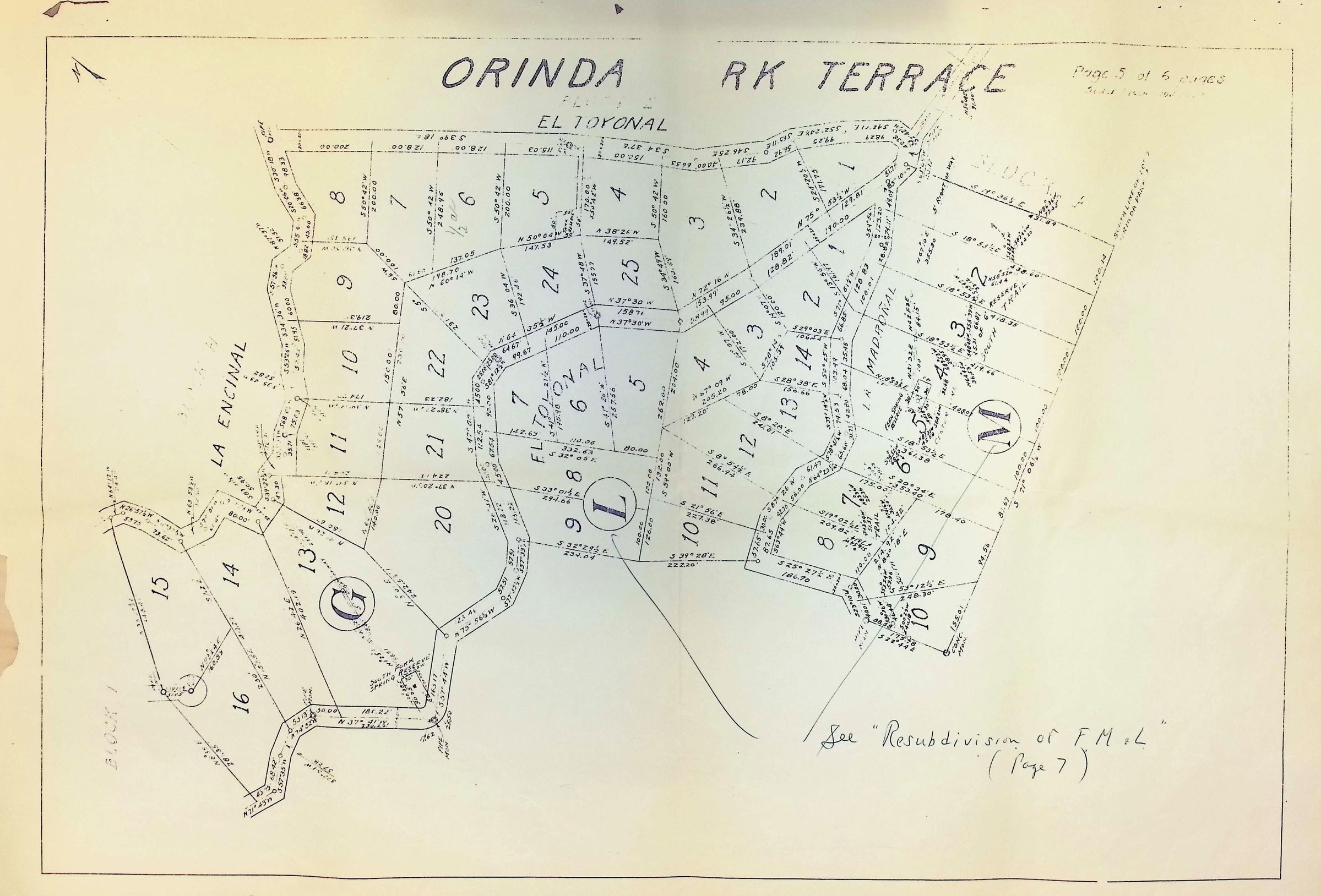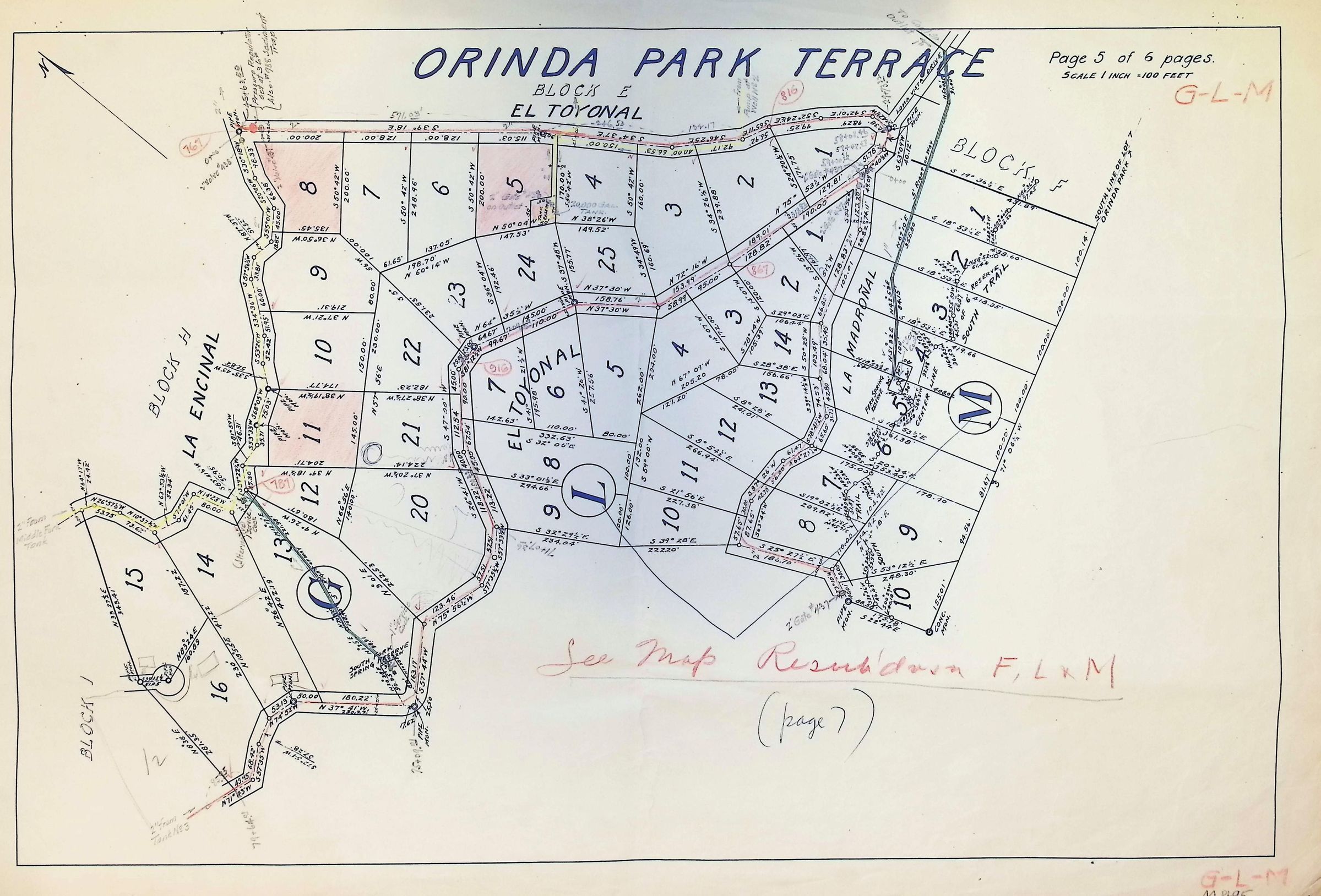 The image is a detailed map titled "Orinda Park Terrace" depicting a residential area divided into various numbered lots. The layout shows intricate boundaries with measurements noted in degrees and feet, suggesting precise surveying. Streets named La Encinal, El Toyonal, and La Madronal interconnect the parcels. Annotations, some in red, highlight certain sections, and areas G, L, and M. 1922.