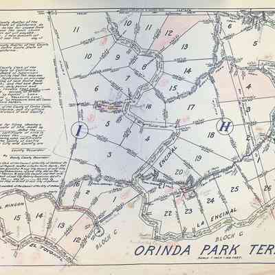The image depicts a detailed survey map of Orinda Park Terrace, delineating various numbered lots (1 through 26) with intricate boundary lines and dimensions. It includes several handwritten annotations and official inscriptions in the left and bottom sections, confirming the map’s certification by the County Auditor and Clerk for Contra Costa County, California. Sections labeled I and H and roads such as Canon Drive, El Rincon, and El Toyonal are clearly marked, along with geographical identifiers. 1922.