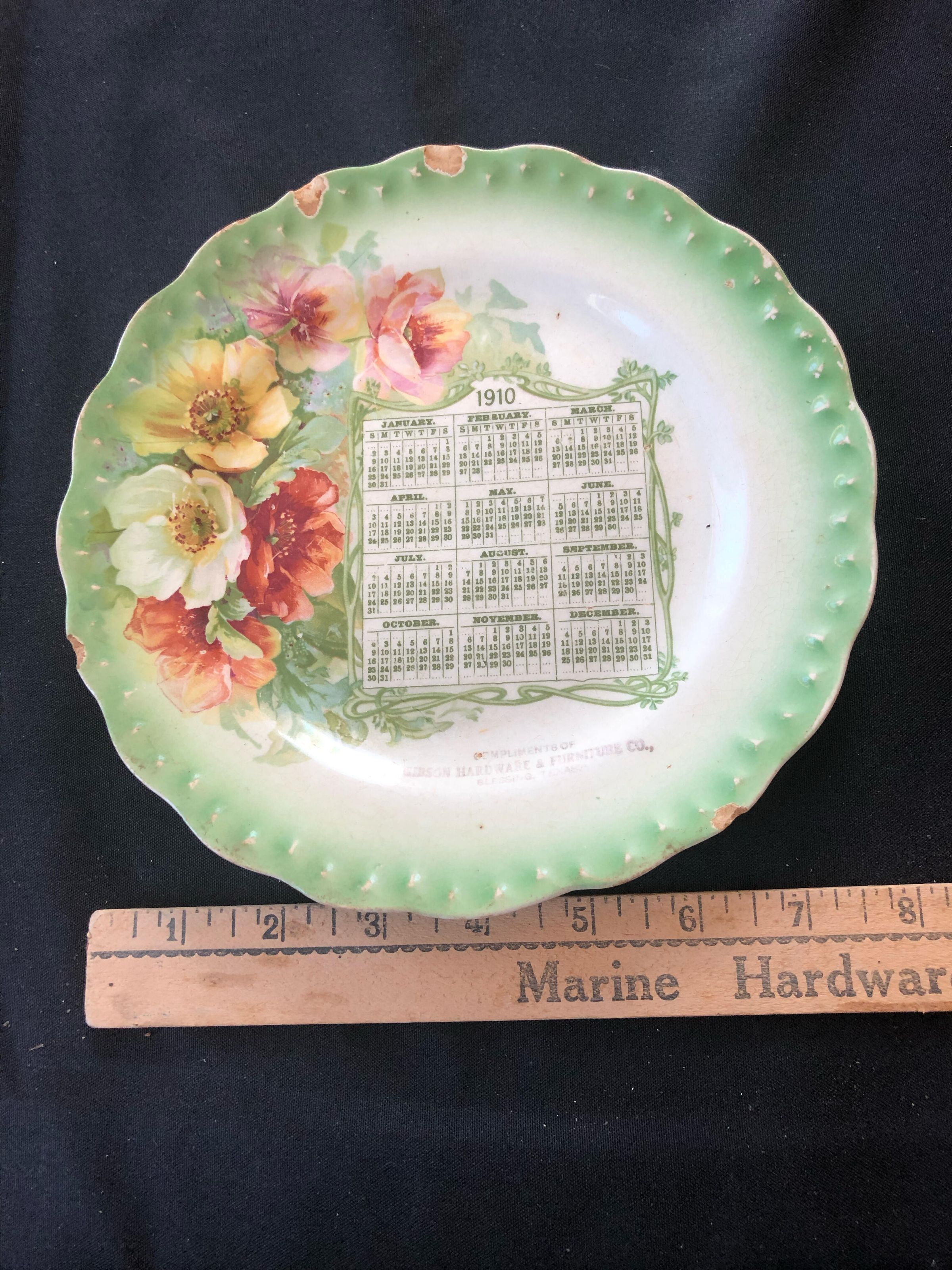 Green plate with a white center, colorful flowers along the side and a 1910 calendar in the center